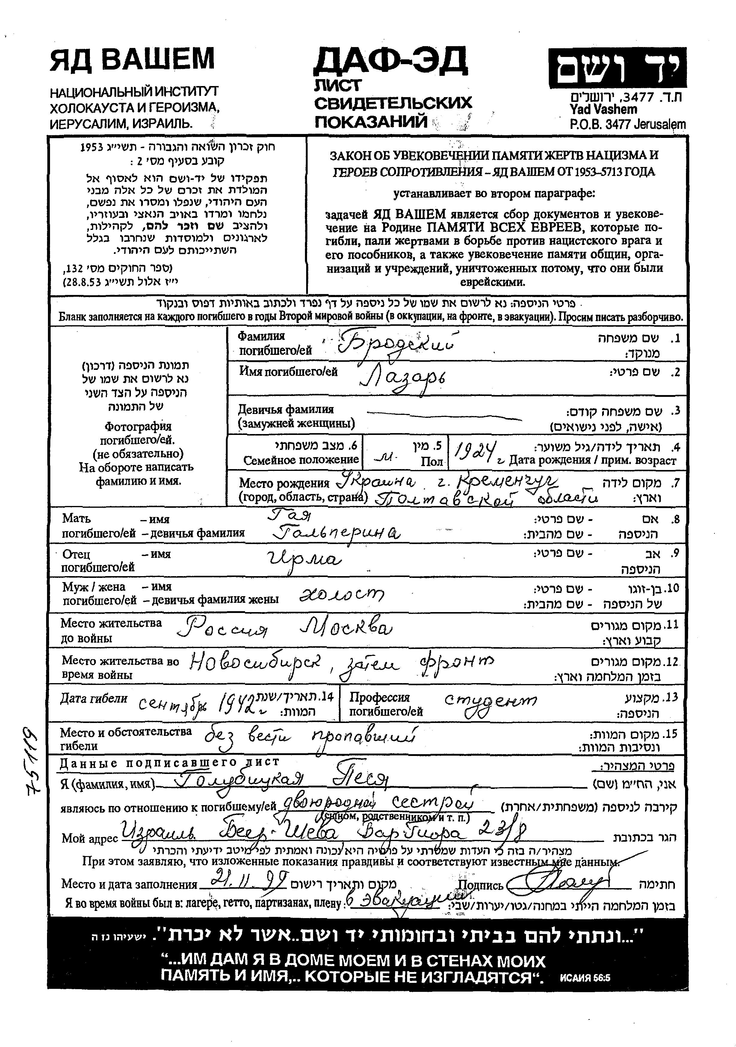 Brodski Lazar 1924 Moskva, Russie (URSS) Feuille de témoignage