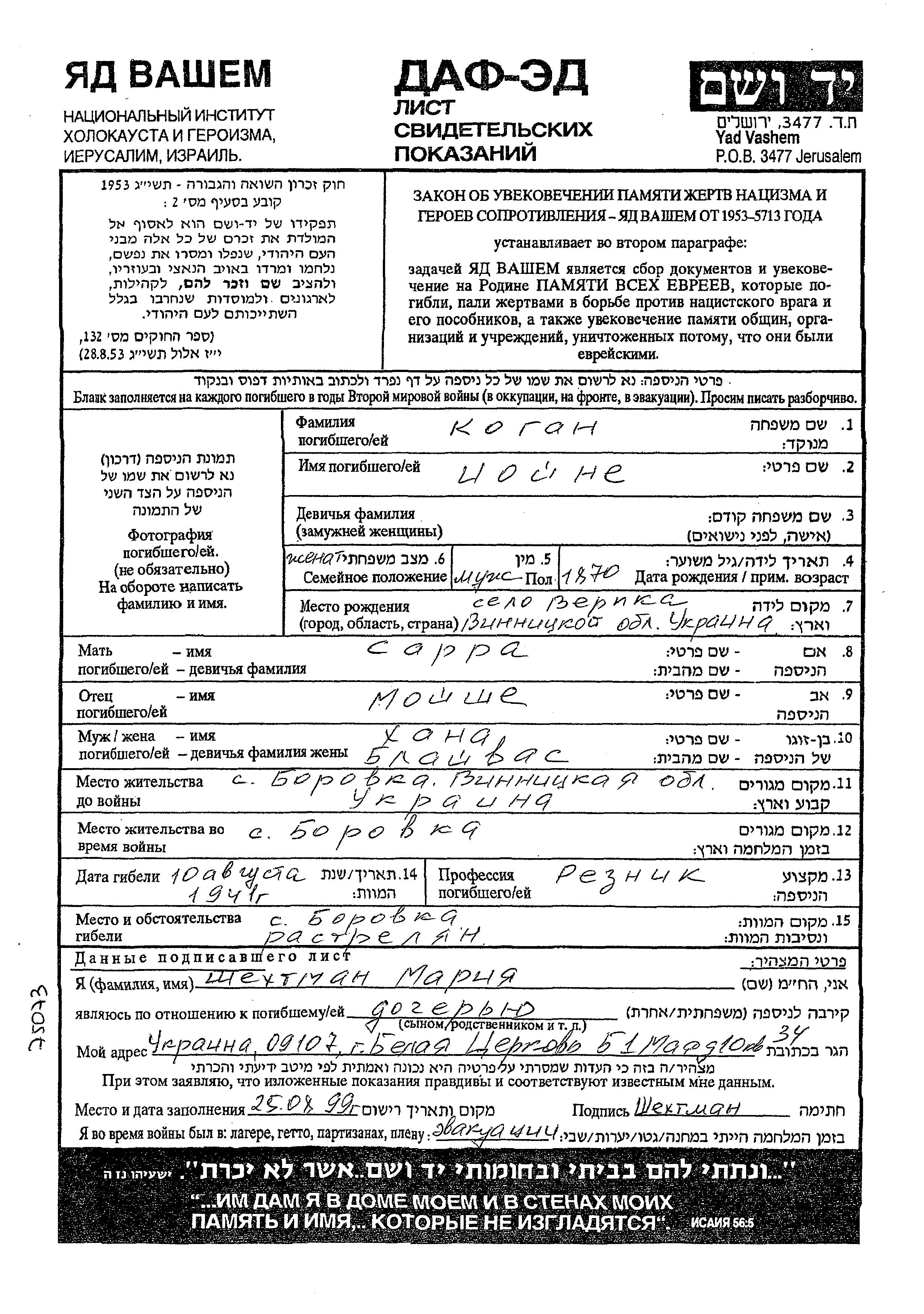 Kogan Ioine 1870 Borovka, Ukraine (URSS) Feuille de témoignage