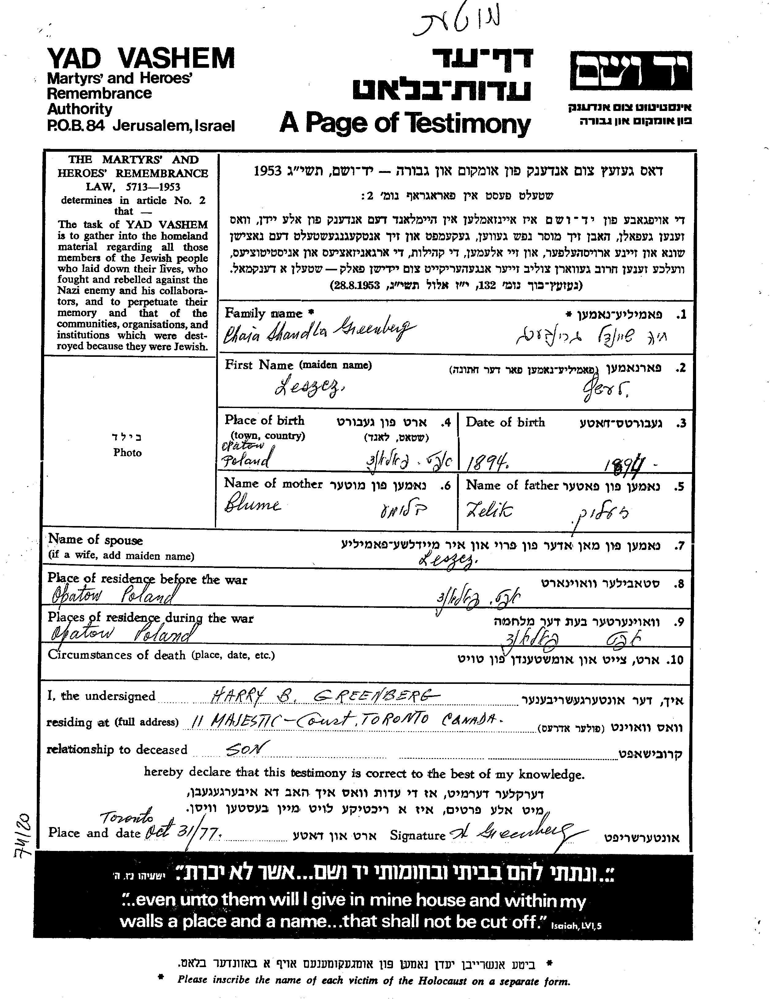 Grienberg Chaia Shandla 1894 Opatow, Pologne Feuille de témoignage