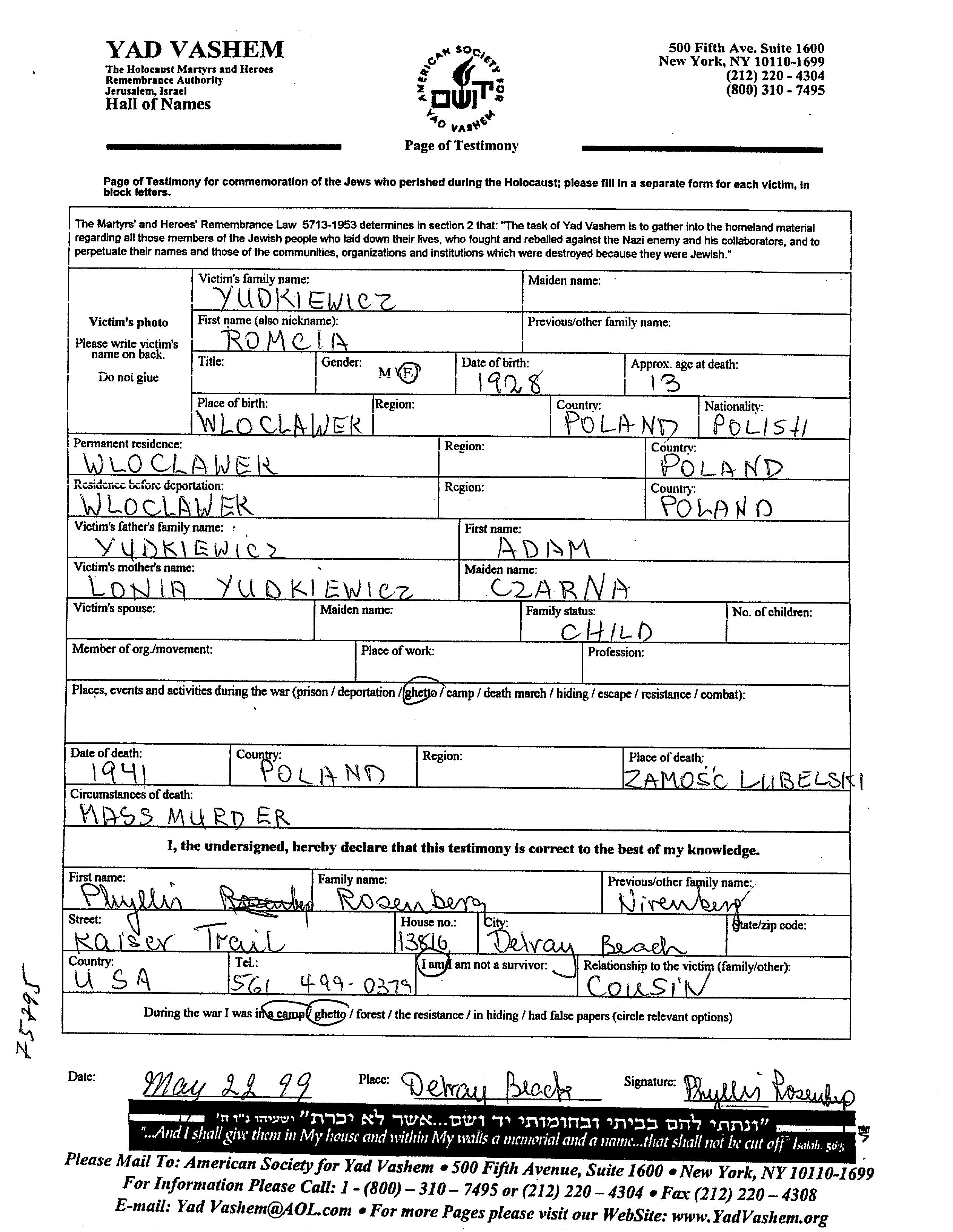 Romcia a été assassiné pendant la Shoah. Lieu de la mort: Zamosc, Pologne en 1941.