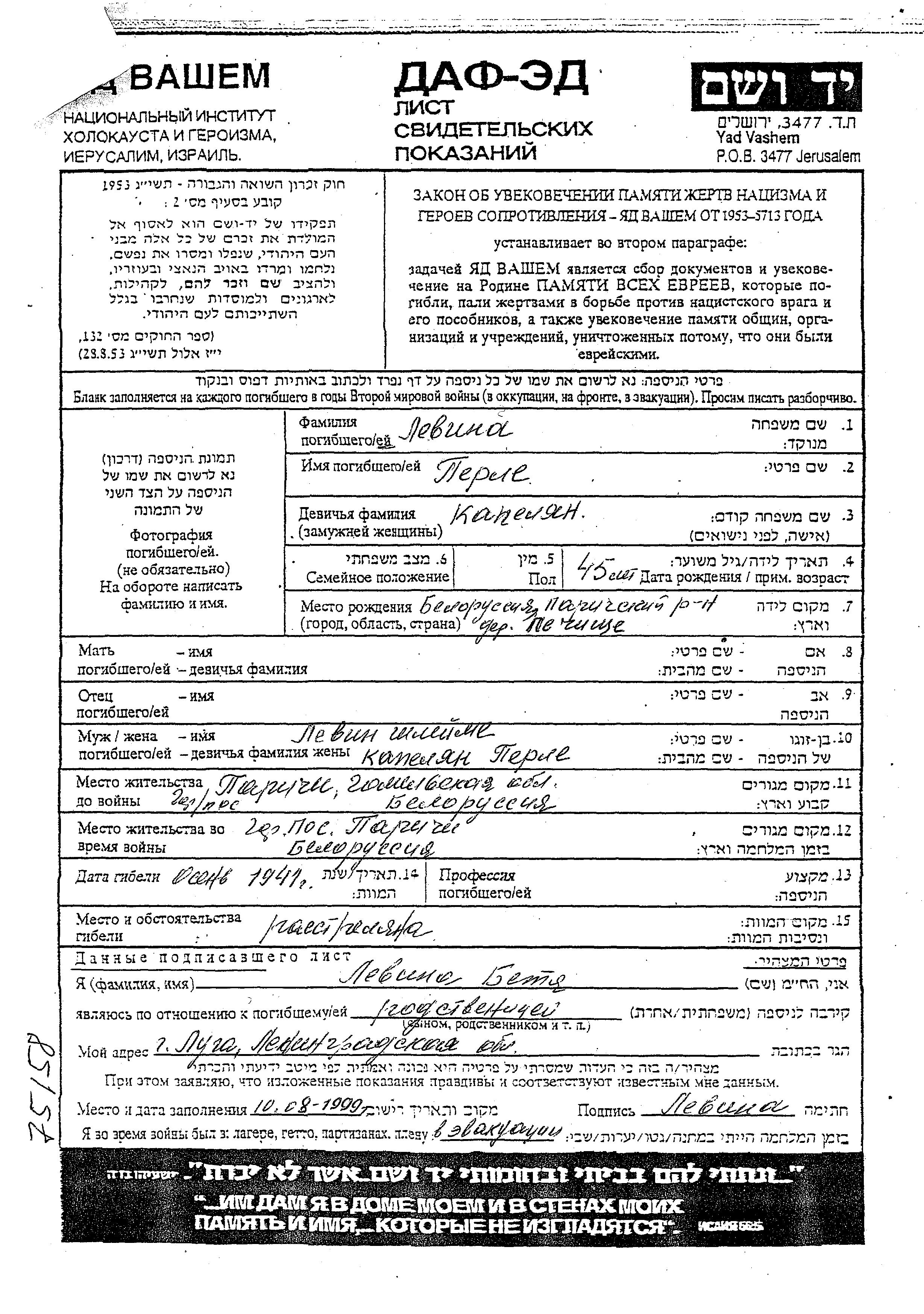 Levin Perla Parichi, Bélorussie (URSS) Feuille de témoignage