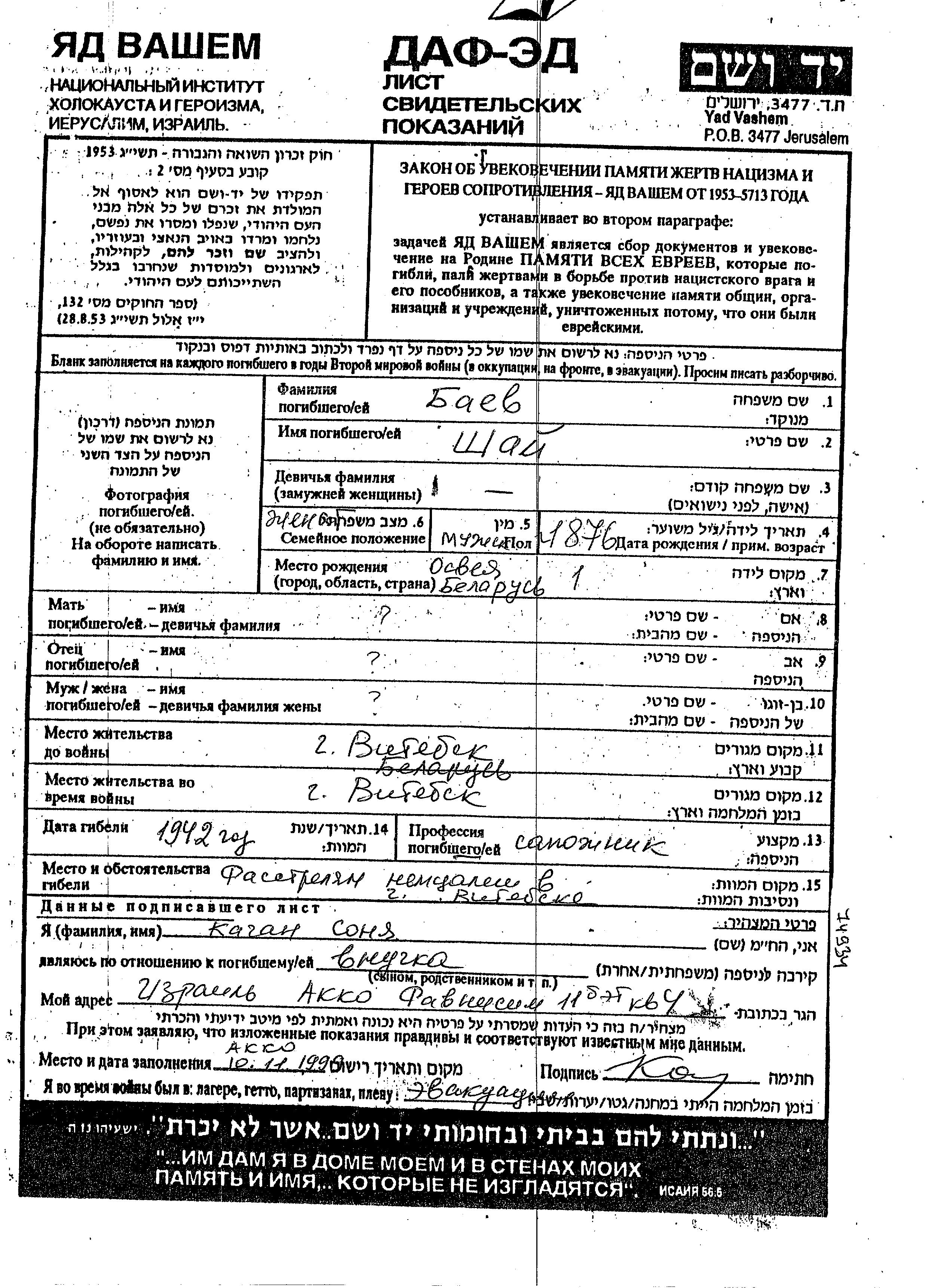 Shai Bayev est né à Osveya, Bélorussie (URSS) en 1876. Il était Cordonnier et Marié. Avant la seconde guerre mondiale il vivait à Vitebsk, Bélorussie (URSS). Au cours de la guerre, il était à Vitebsk, Bélorussie (URSS).