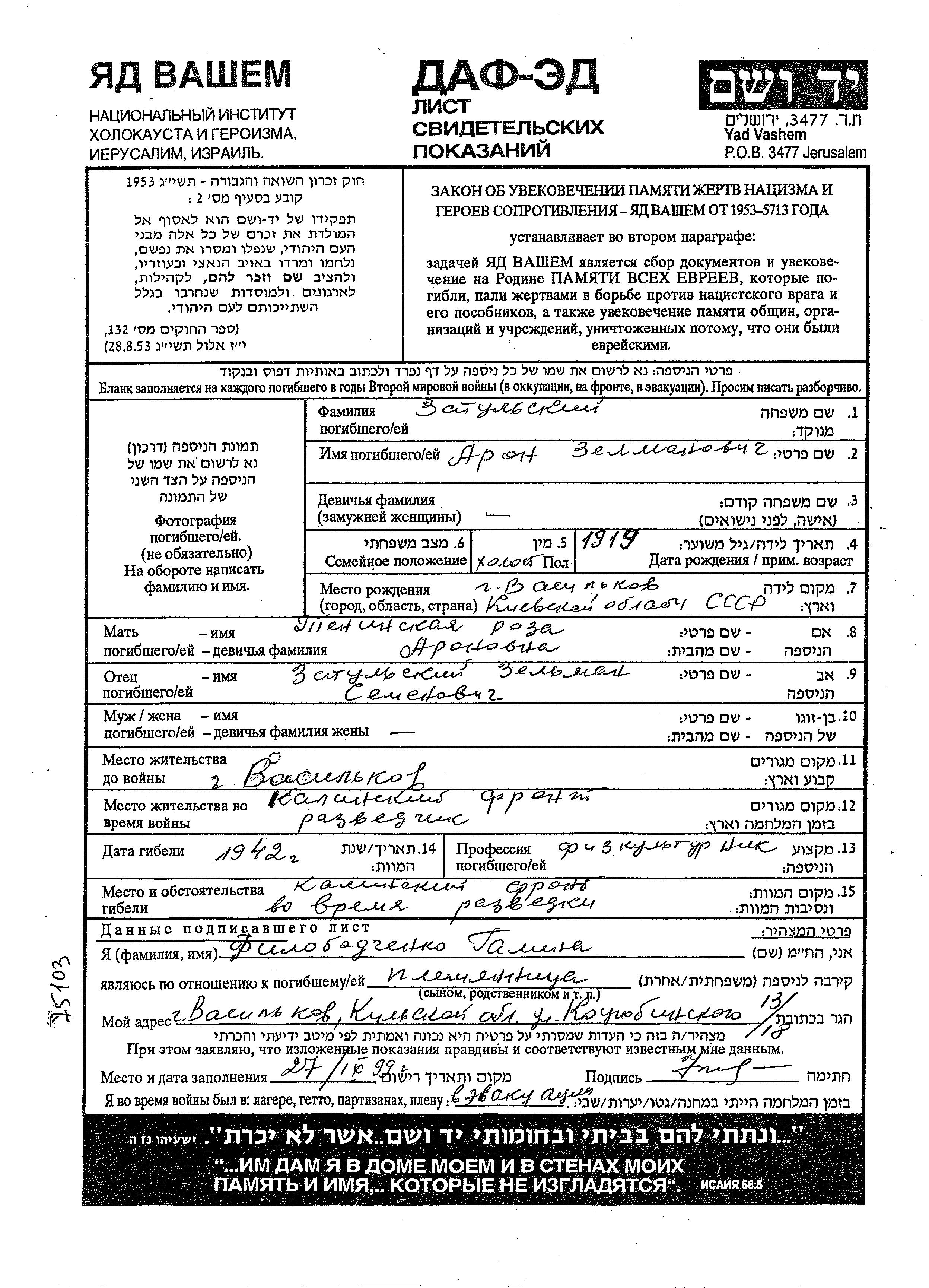 Zatulski Aron 1919 Vasilkov, Ukraine (URSS) Feuille de témoignage