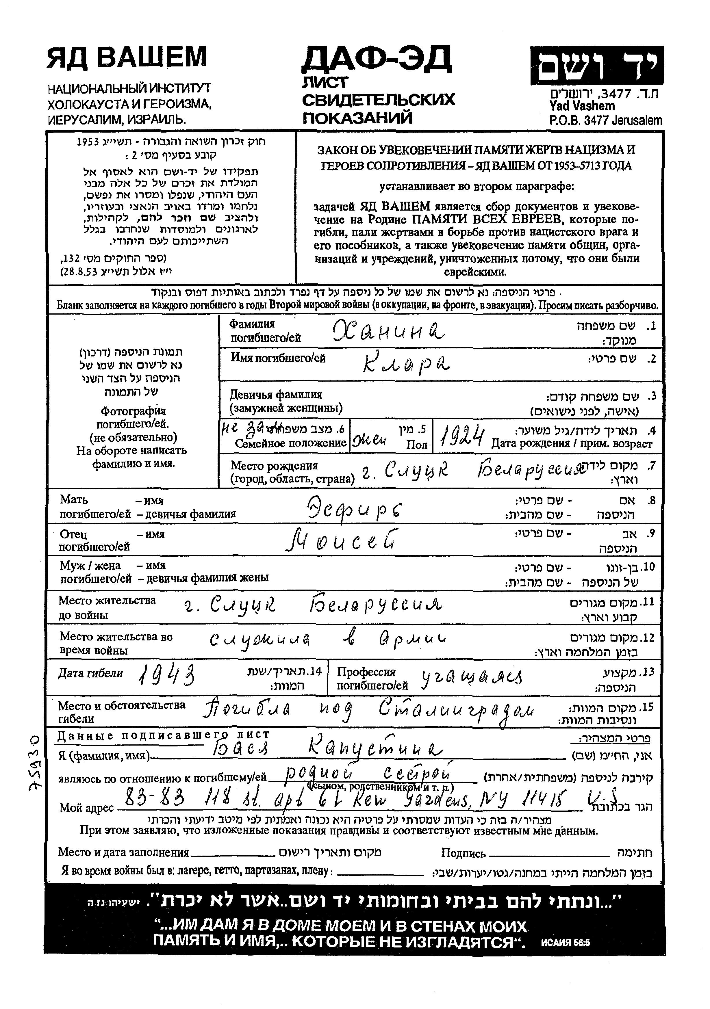 Khanina Klara 1924 Slutsk, Bélorussie (URSS) Feuille de témoignage