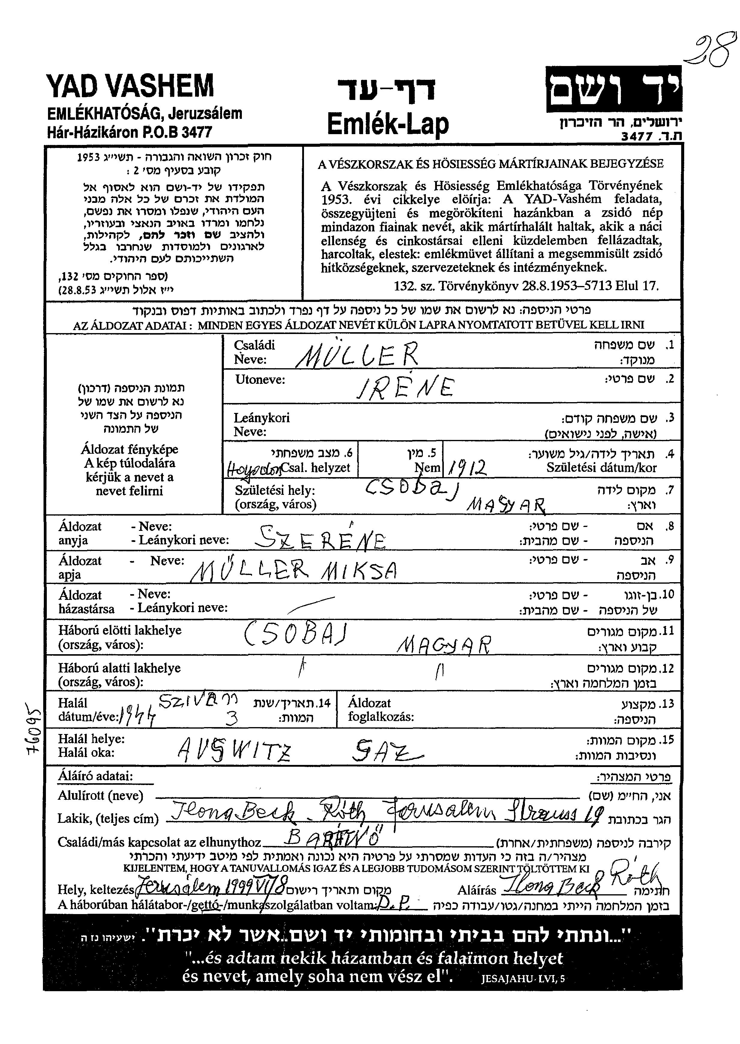 Mueller Irene 1912 Csobaj, Hongrie Feuille de témoignage