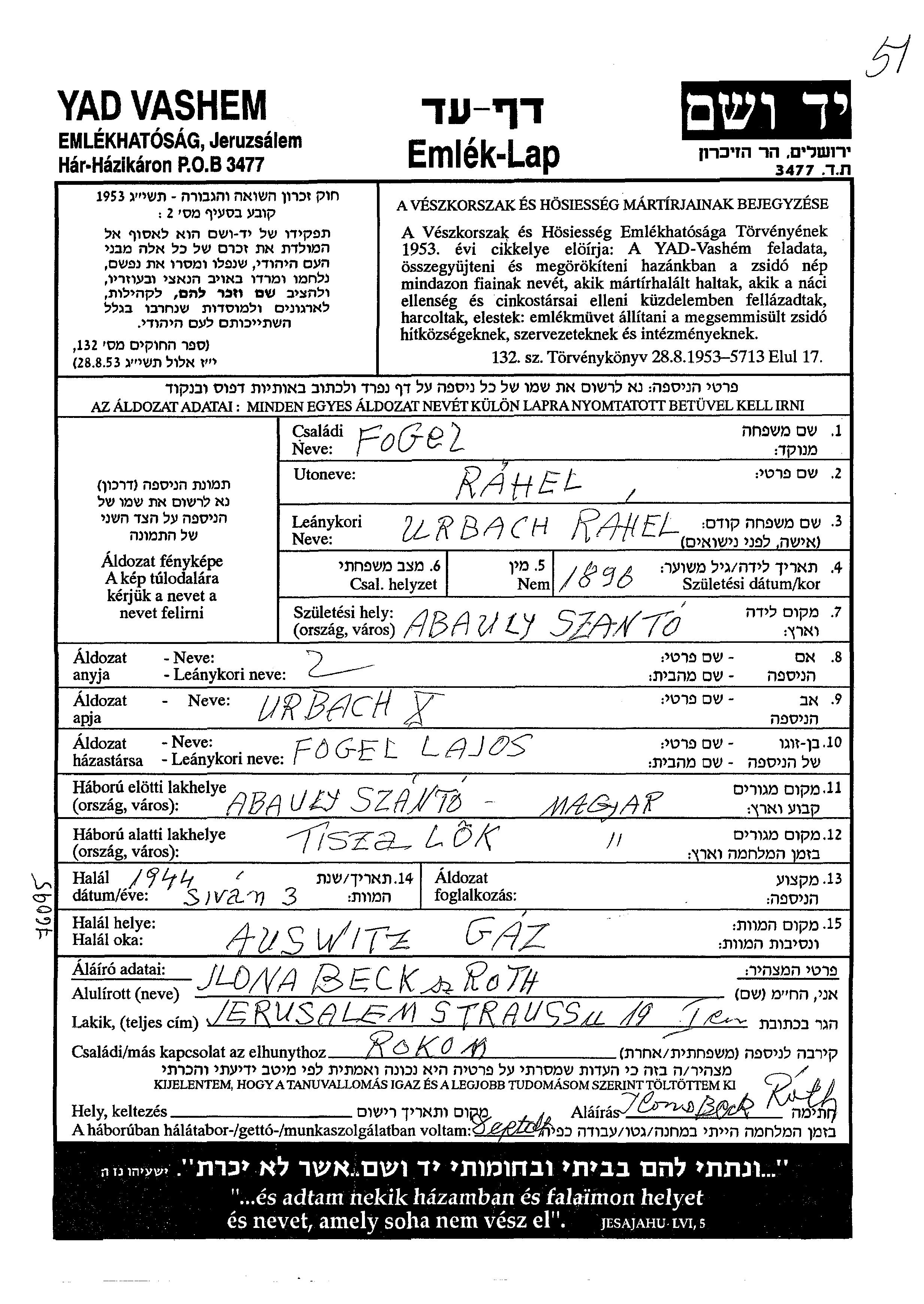 Fogel Rahel 1896 Abaujszanto, Hongrie Feuille de témoignage