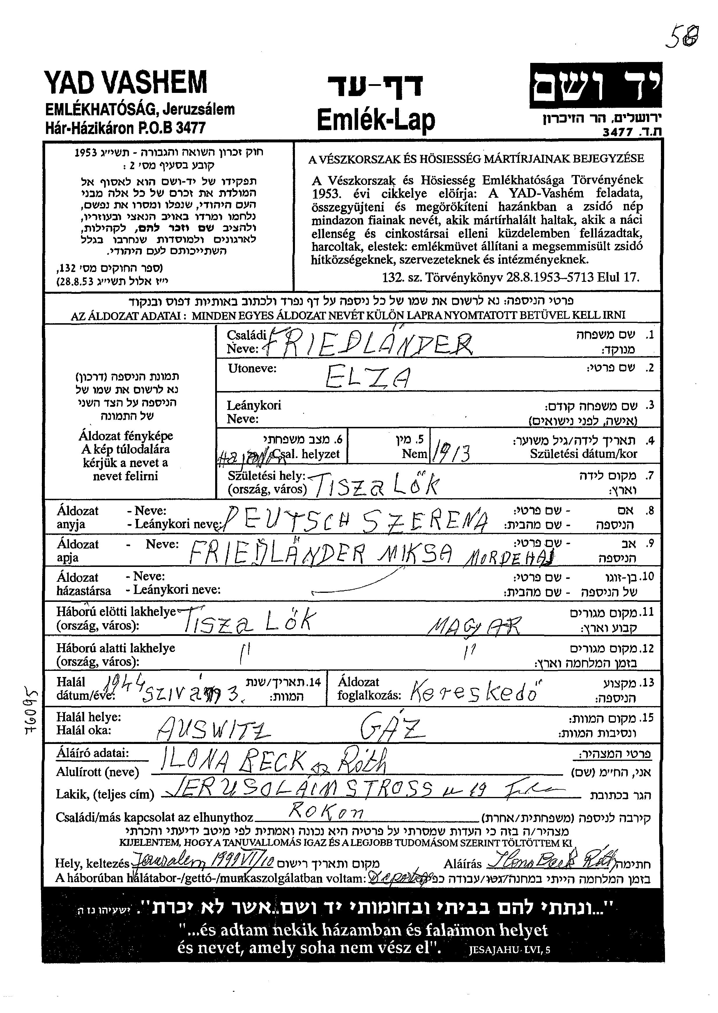 Friedlander Elza 1913 Tiszalok, Hongrie Feuille de témoignage