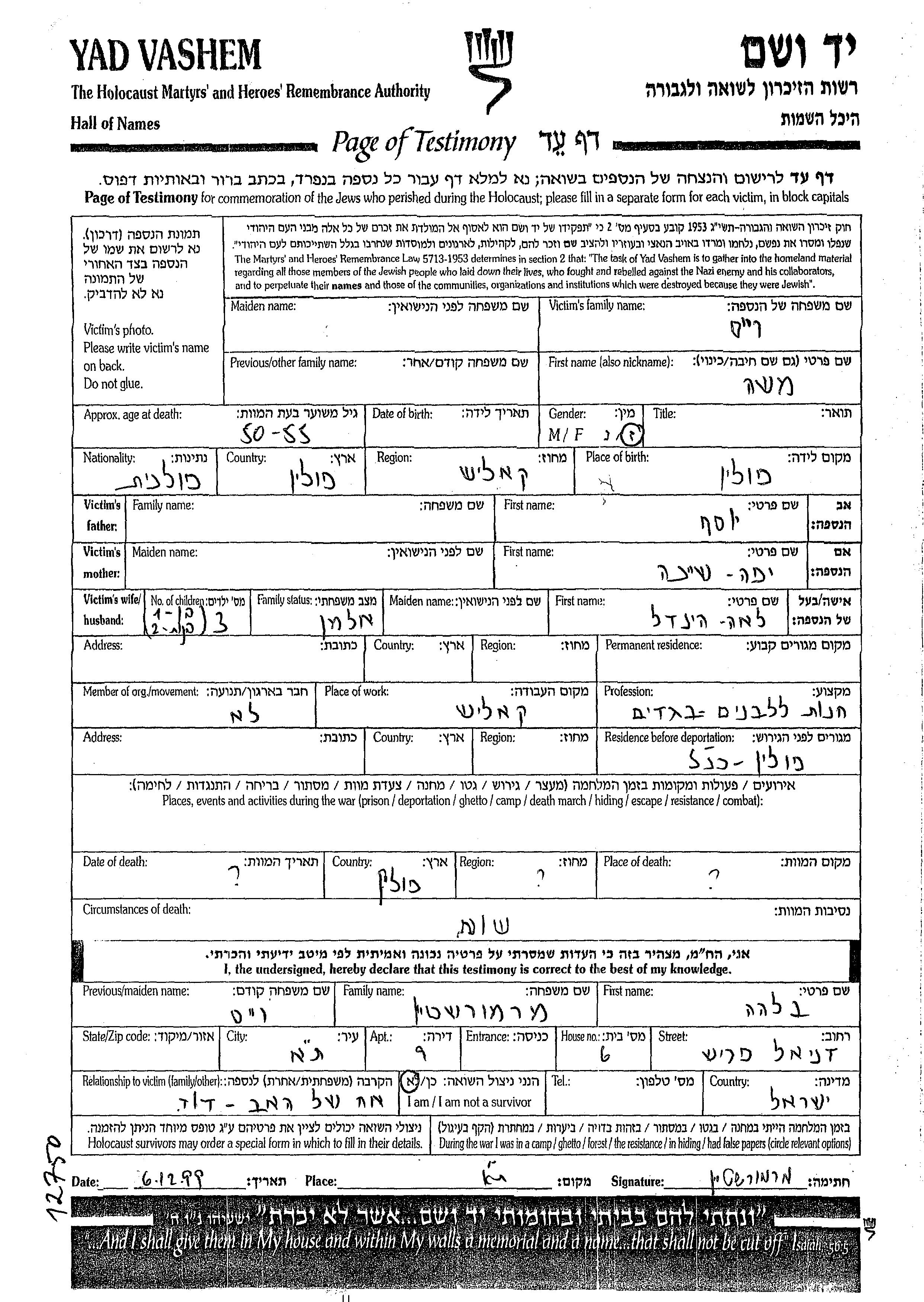 Veis Moshe endroit inconnu, Feuille de témoignage