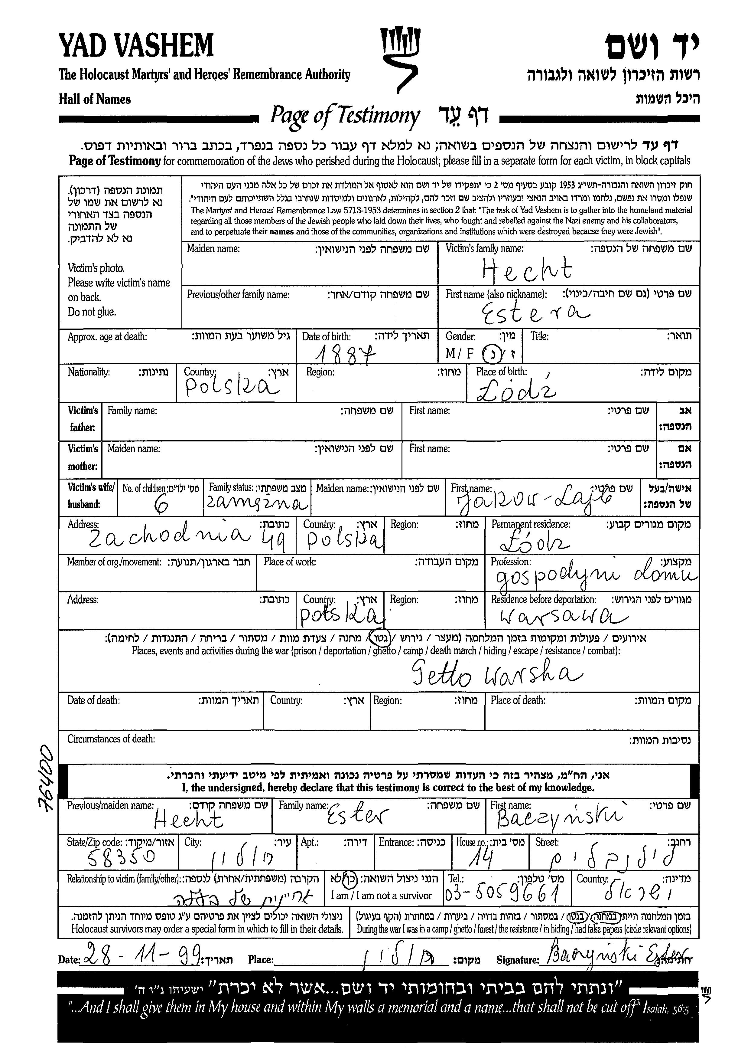 Hecht Estera 1887 Lodz, Pologne Feuille de témoignage