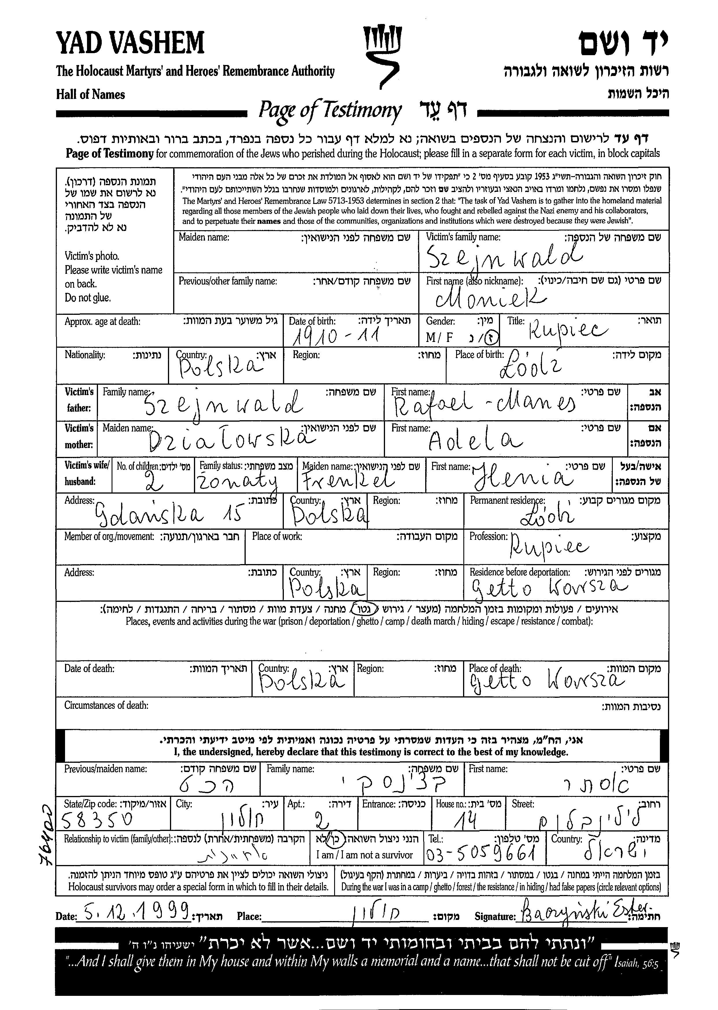 Szejnwald Moniek 1910 Lodz, Pologne Feuille de témoignage