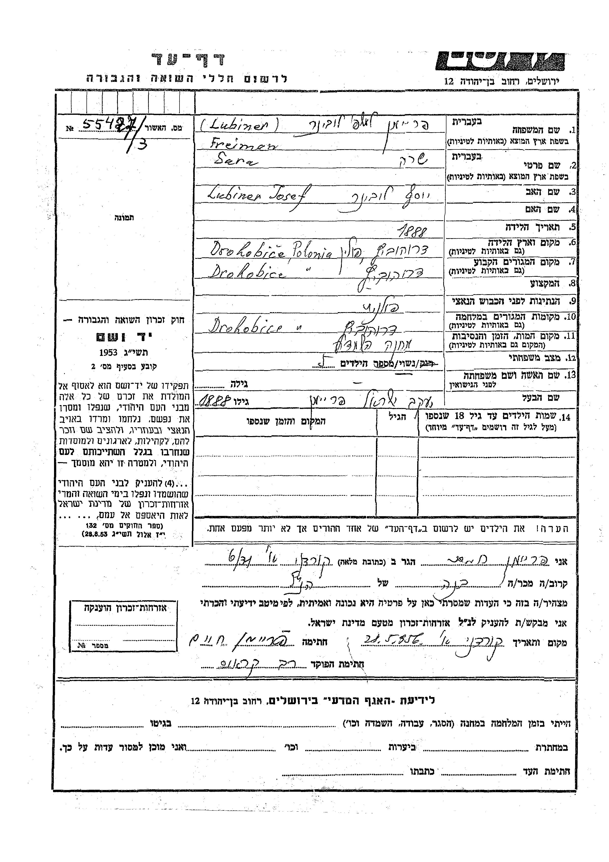 Sara Freiman née Lubiner est née à Drohobiez, Pologne en 1888, fille de Yosef. Elle était Mariée à Yaakov Yisrael. Avant la seconde guerre mondiale elle vivait à Drohobiez, Pologne. Pendant la guerre, elle était à Drohobiez, Pologne.