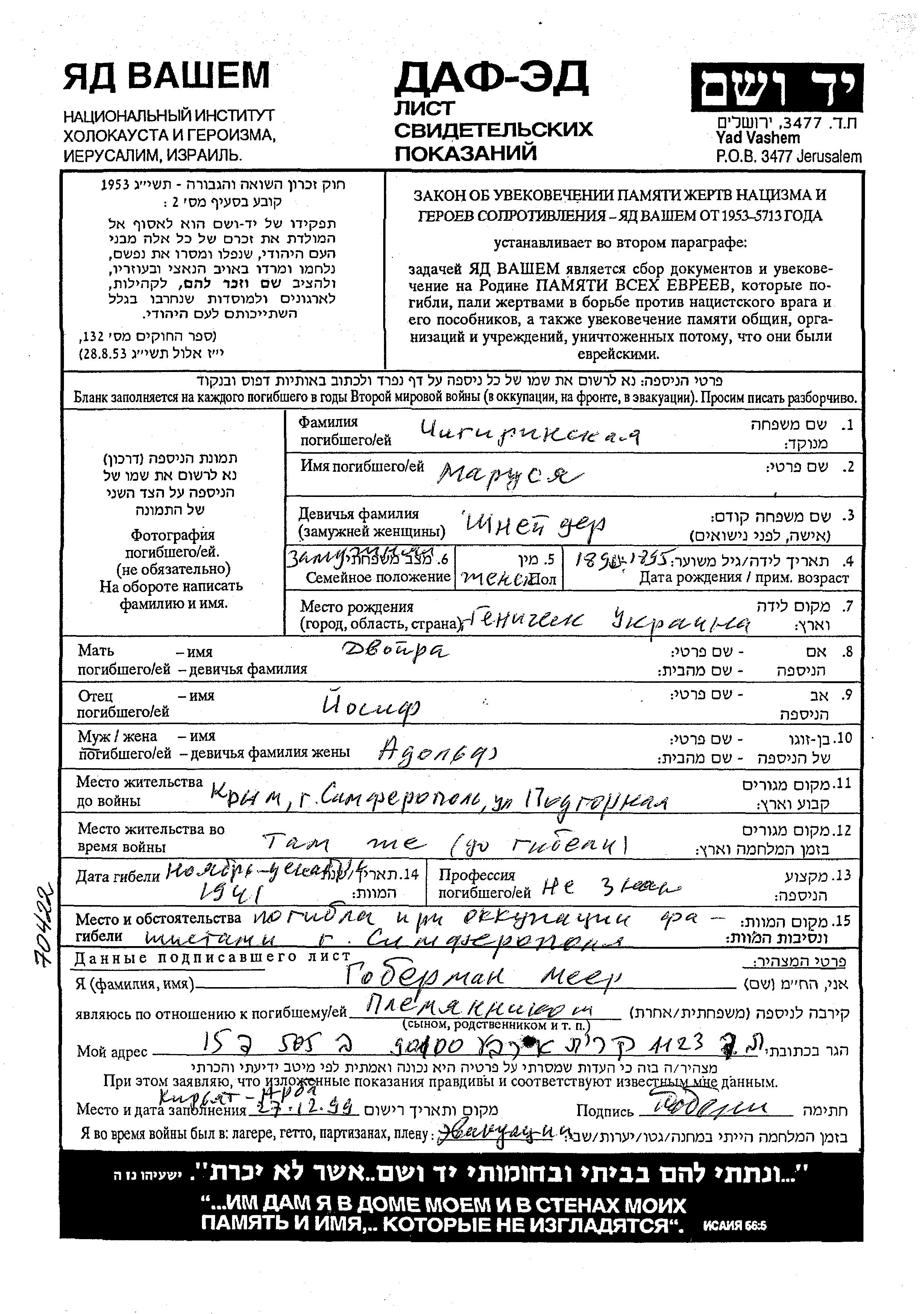 Marusya Chigirinski née Shneider est née à Genichesk, Ukraine (URSS) en 1890, fille de Iosif et de Dvoira. Elle était Mariée à Adolf. Avant la seconde guerre mondiale elle vivait à Simferopol, Russie (URSS). Pendant la guerre, elle était à Simferopol, Russie (URSS).