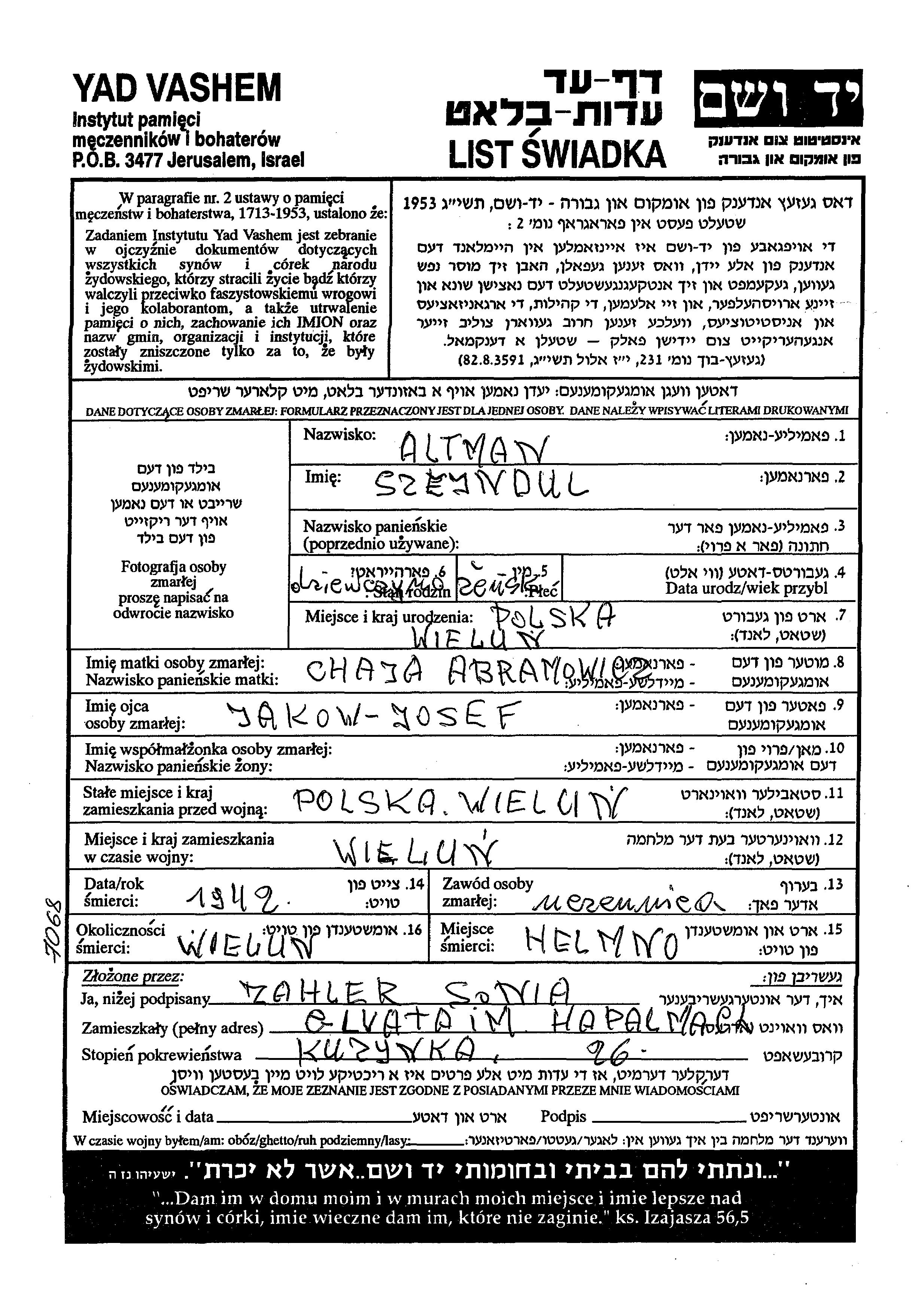 Altman Szejndul Wielun, Pologne Feuille de témoignage
