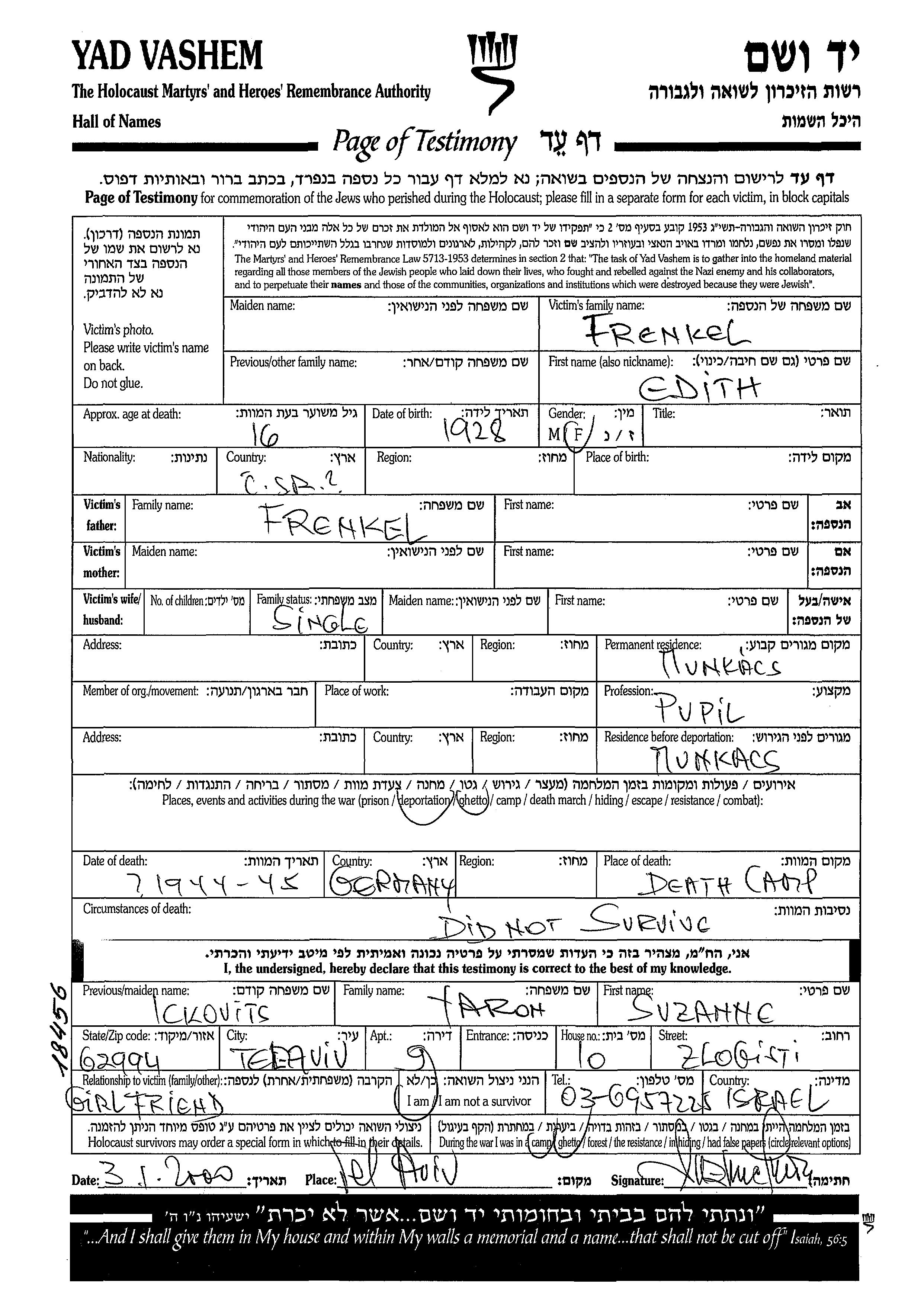 Frenkel Edith 1928 Munkac, Tchécoslovaquie Feuille de témoignage