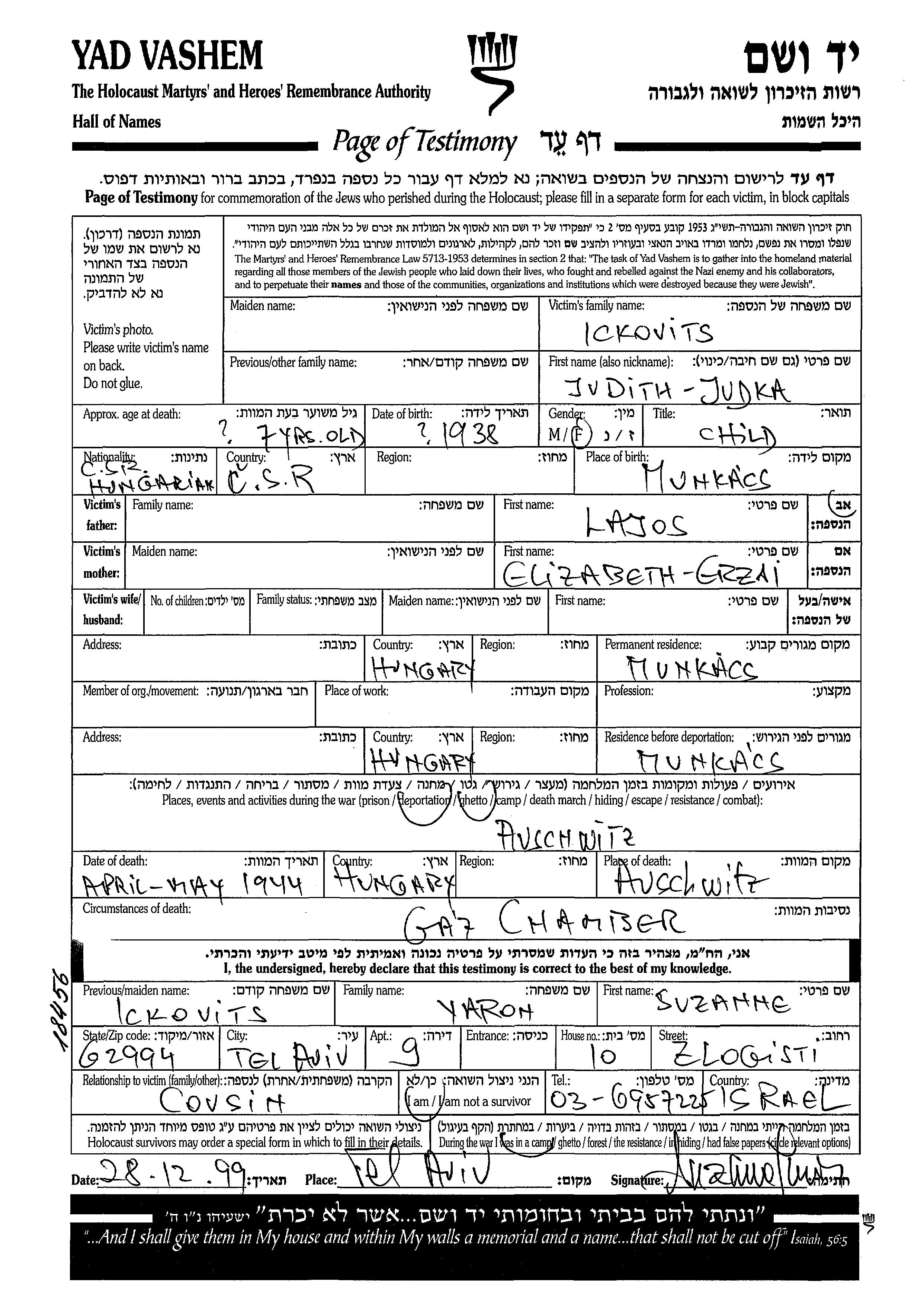 Ickovits Judith Judka 1938 Munkacs, Tchécoslovaquie Feuille de témoignage