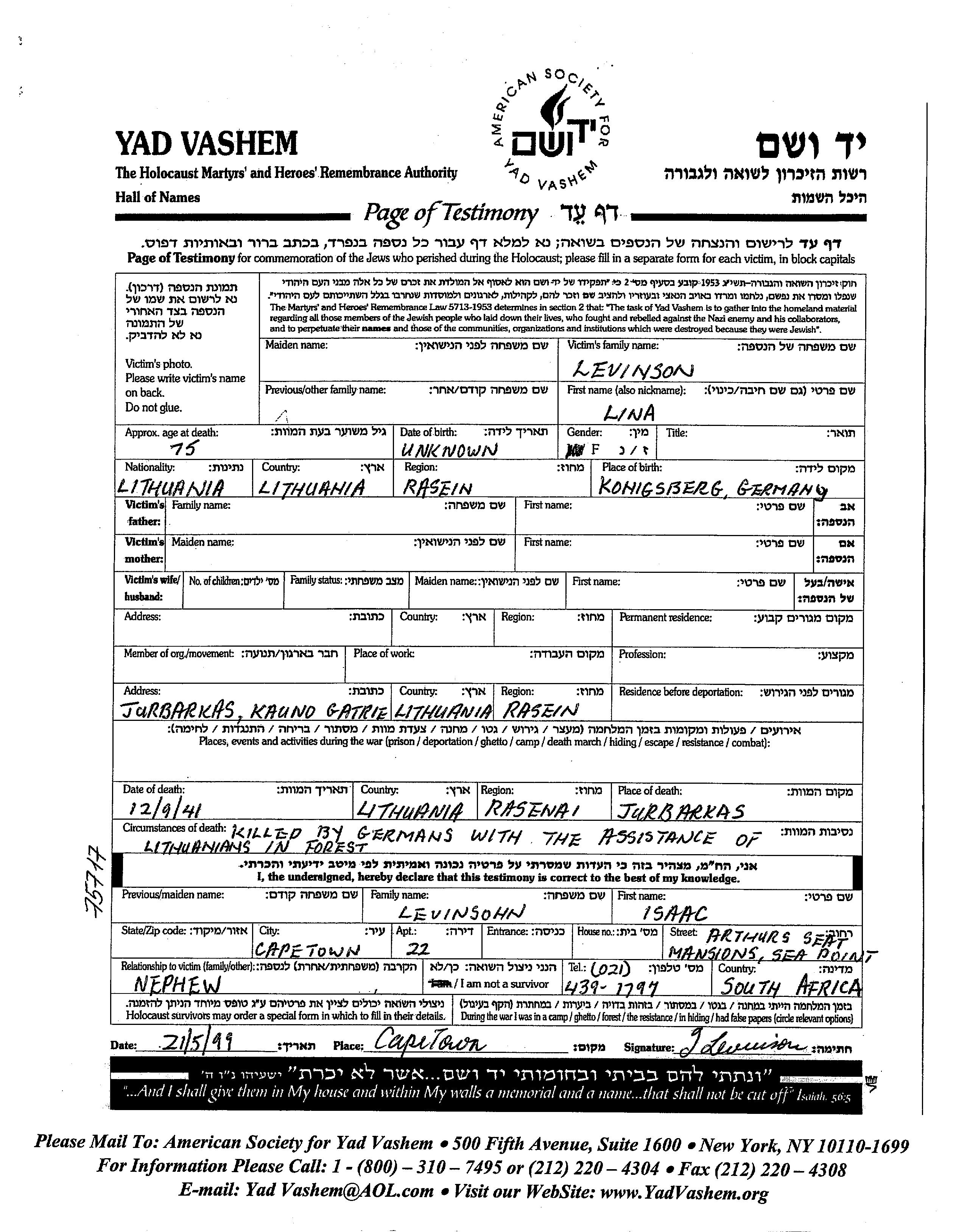 Yad Vashem - Pages of Testimony Names Memorial Collection