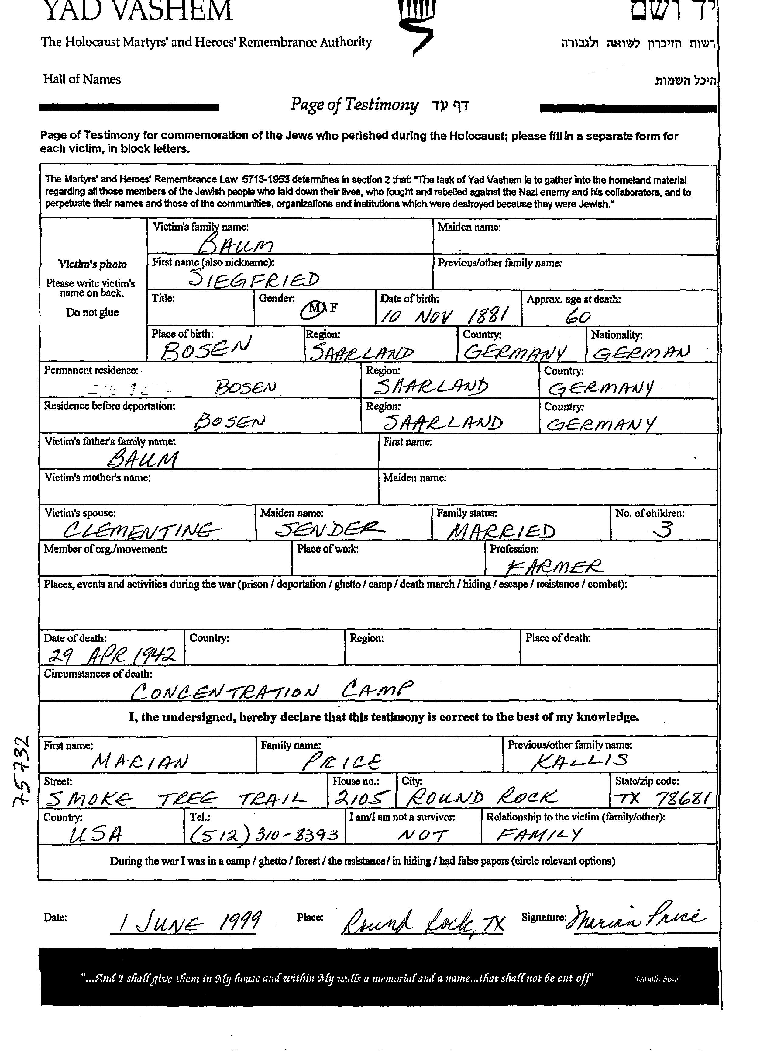 Siegfried Baum est né à Bosen, Allemagne en 1881. Il était Agriculteur et Mariée à Clementine née Sender. Avant la seconde guerre mondiale il vivait à Bosen, Allemagne. Au cours de la guerre, il était à Bosen, Allemagne.