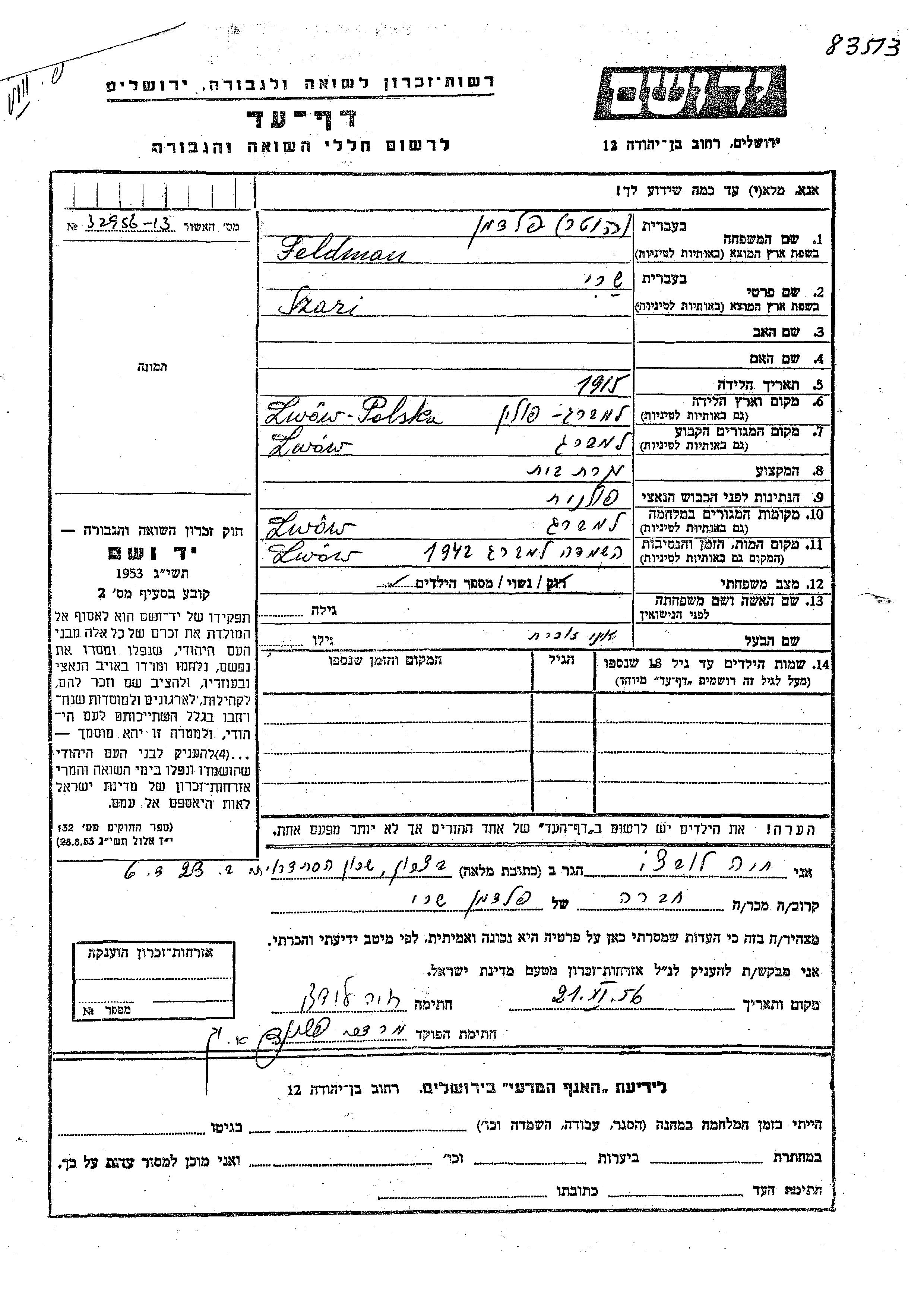 Szari Feldman née Huter est née à Lwow, Pologne en 1915. Elle était Femme au foyer et Mariée. Avant la seconde guerre mondiale elle vivait à Lwow, Pologne. Pendant la guerre, elle était à Lwow, Pologne.
