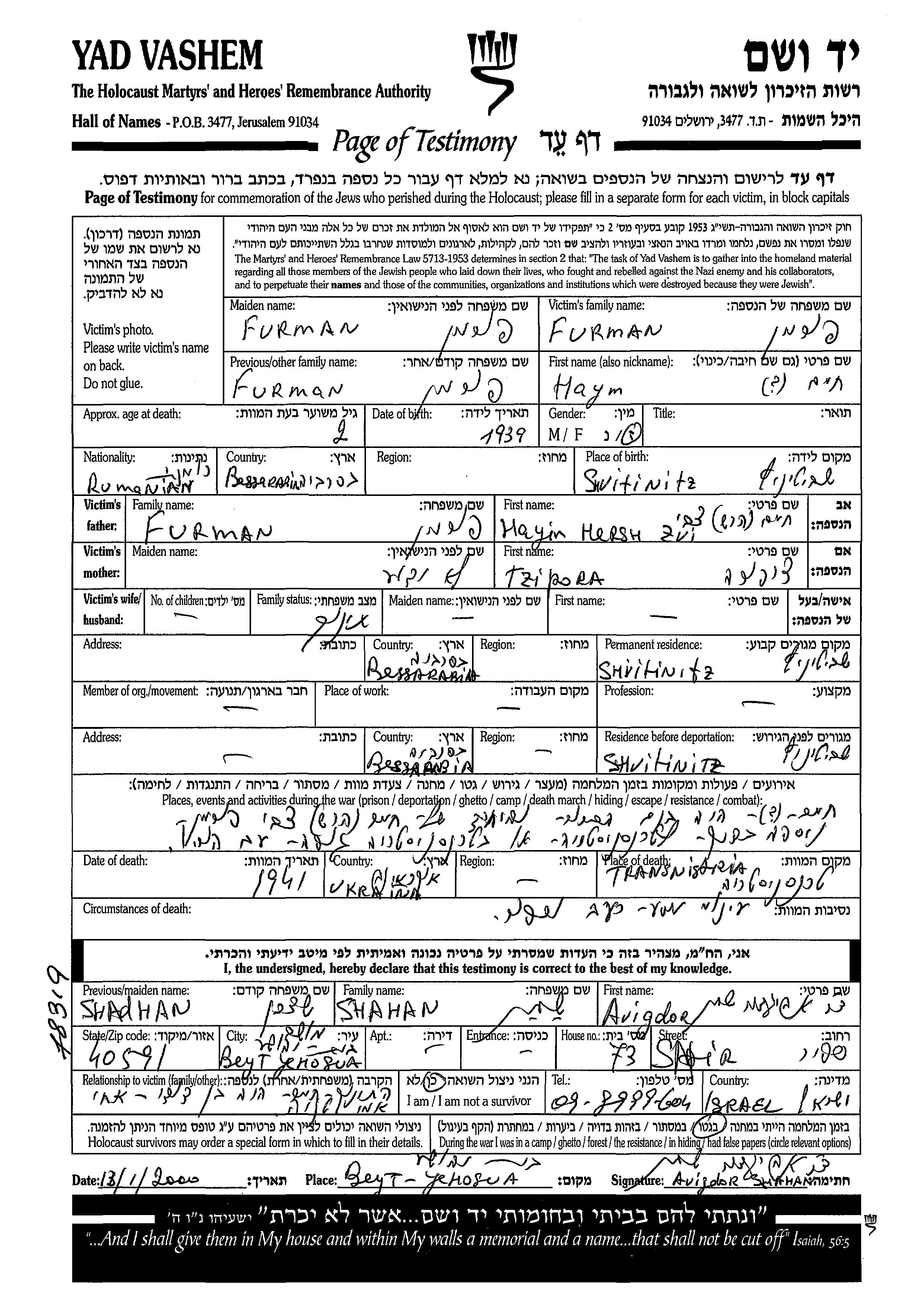Furman Hajm 1939 Sebutinti, Roumanie Feuille de témoignage