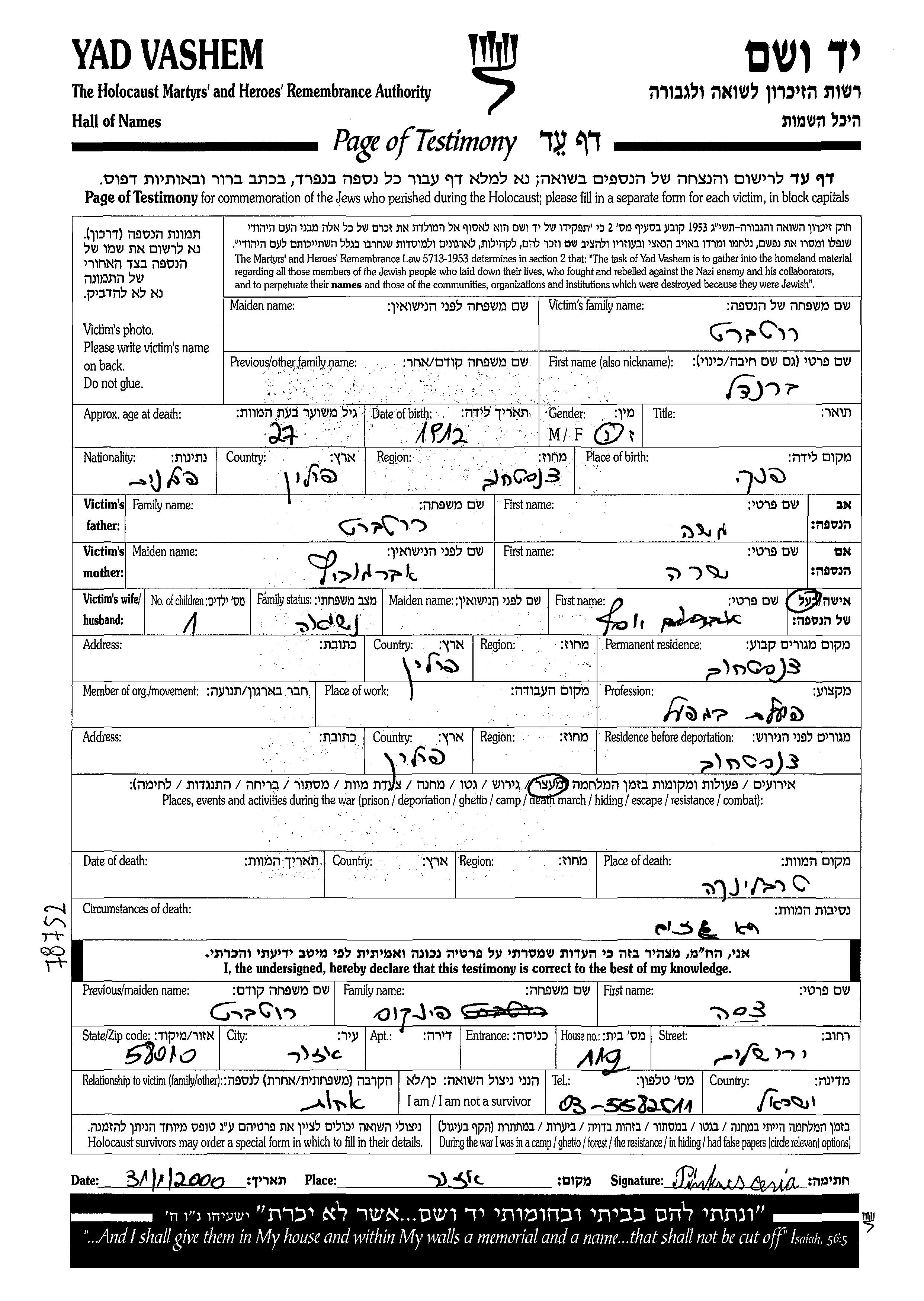 Yad Vashem - Pages of Testimony Names Memorial Collection