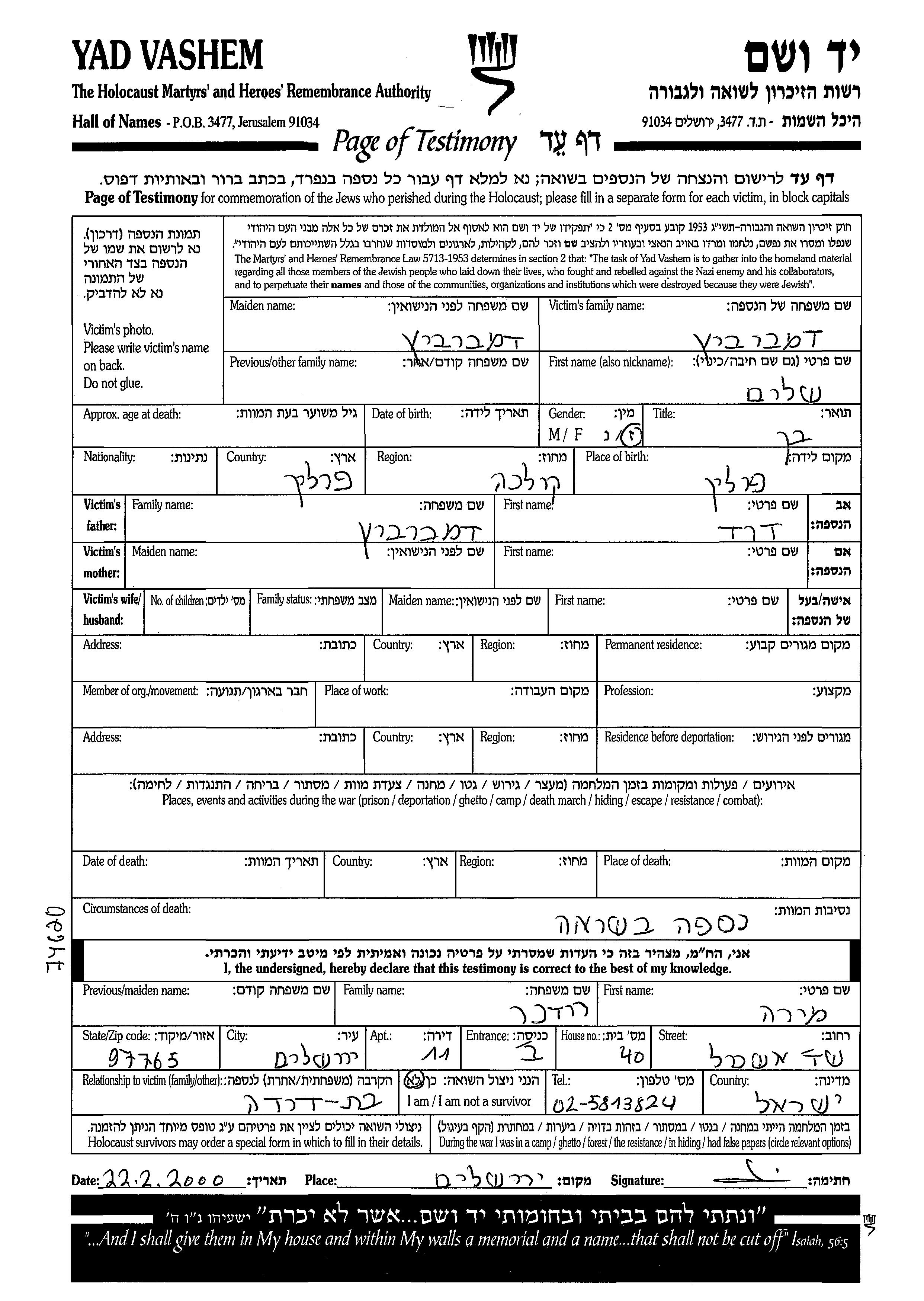 Dembovitz Shalom endroit inconnu, Feuille de témoignage