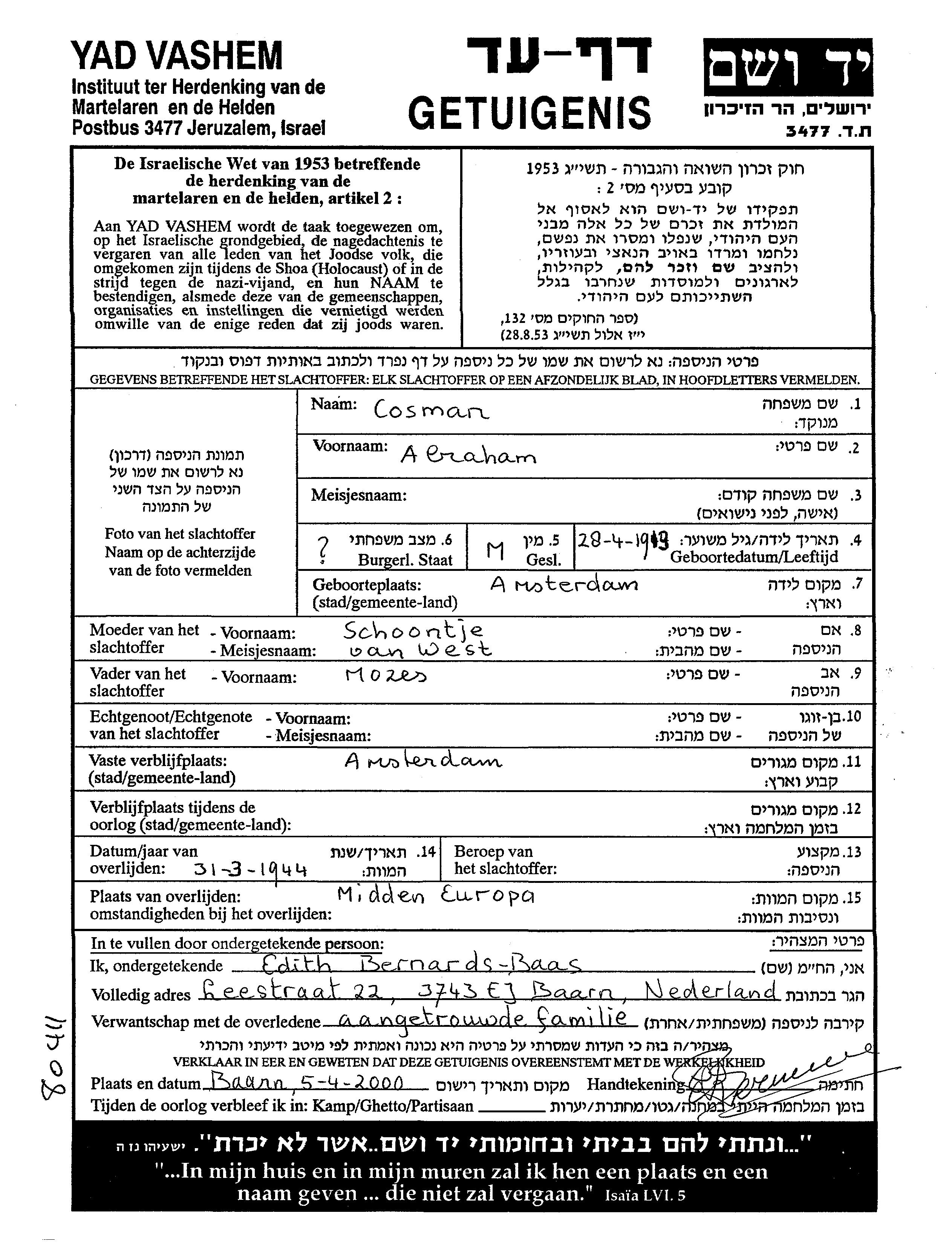 Kosman Abraham 1919 Amsterdam, Pays-Bas Feuille de témoignage