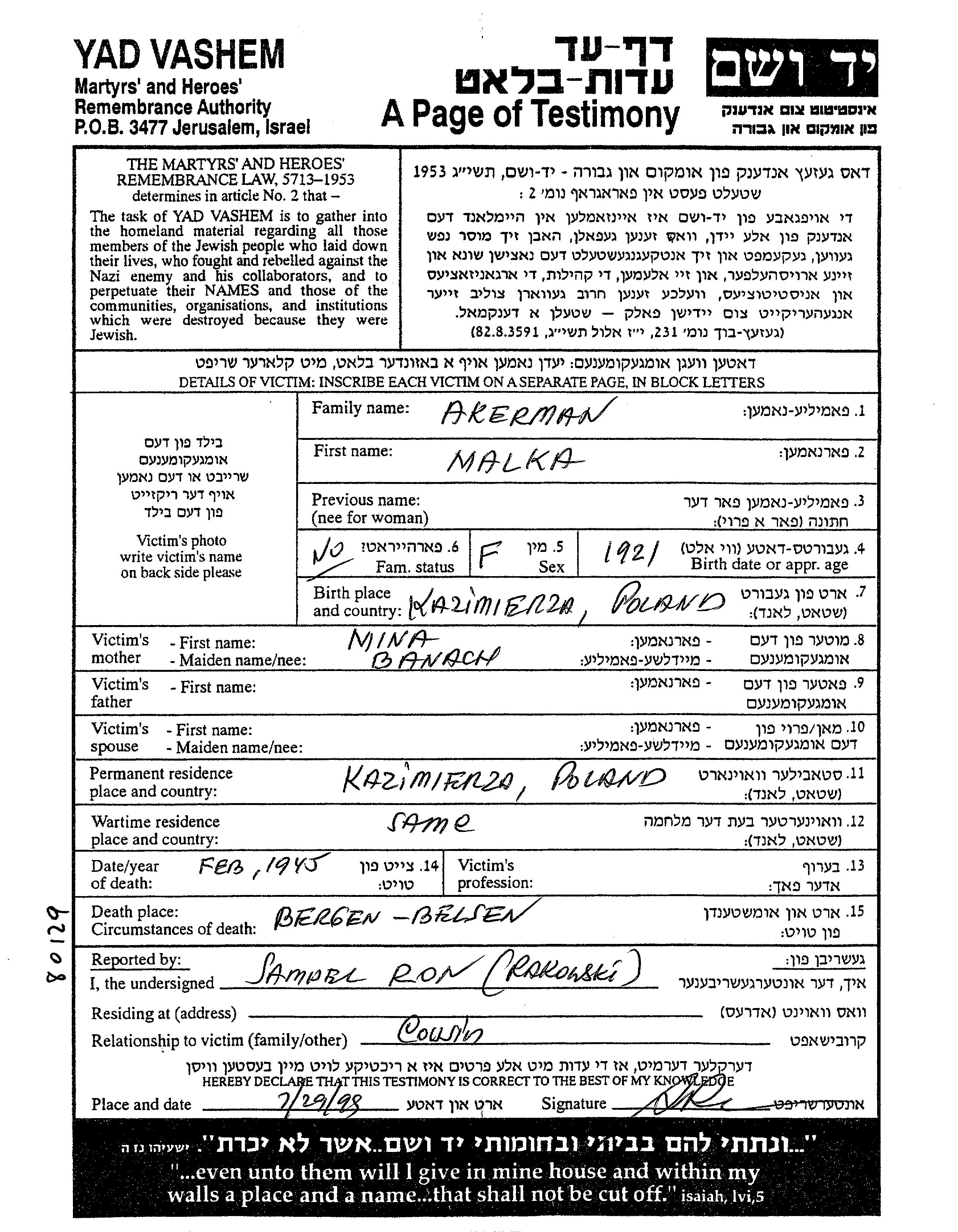 Malka Akerman est née à Kazimierza Wielka, Pologne en 1921, fille de Mina. Elle était Célibataire. Avant la seconde guerre mondiale elle vivait à Kazimierza Wielka, Pologne. Pendant la guerre, elle était à Kazimierza Wielka, Pologne.