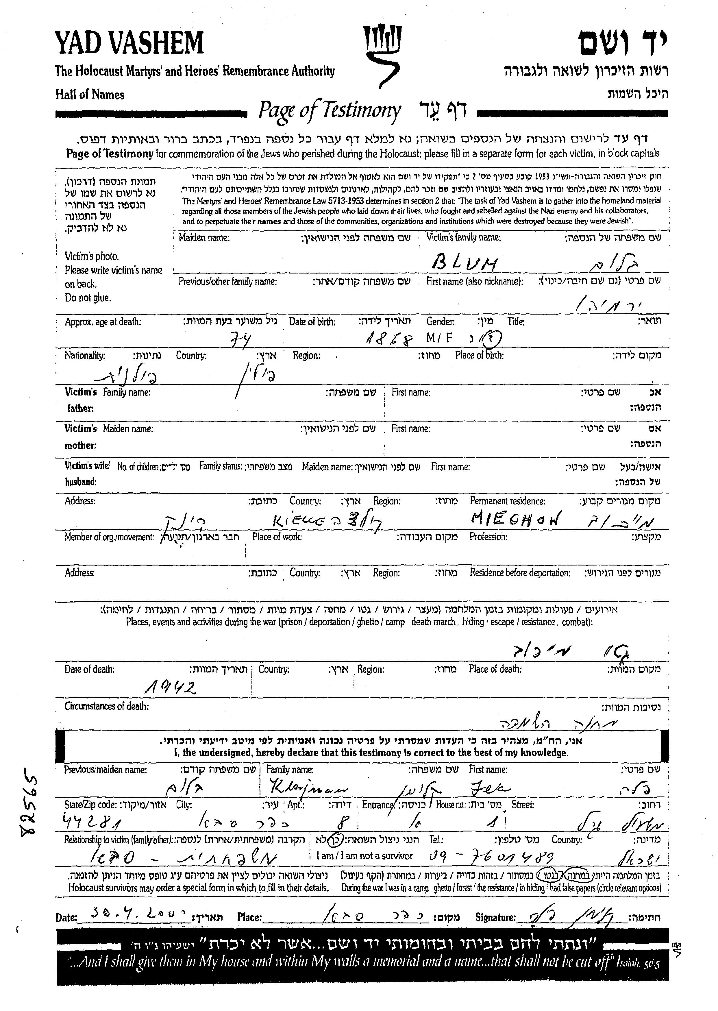 Blum Yermiyahu 1868 Miechow, Pologne Feuille de témoignage