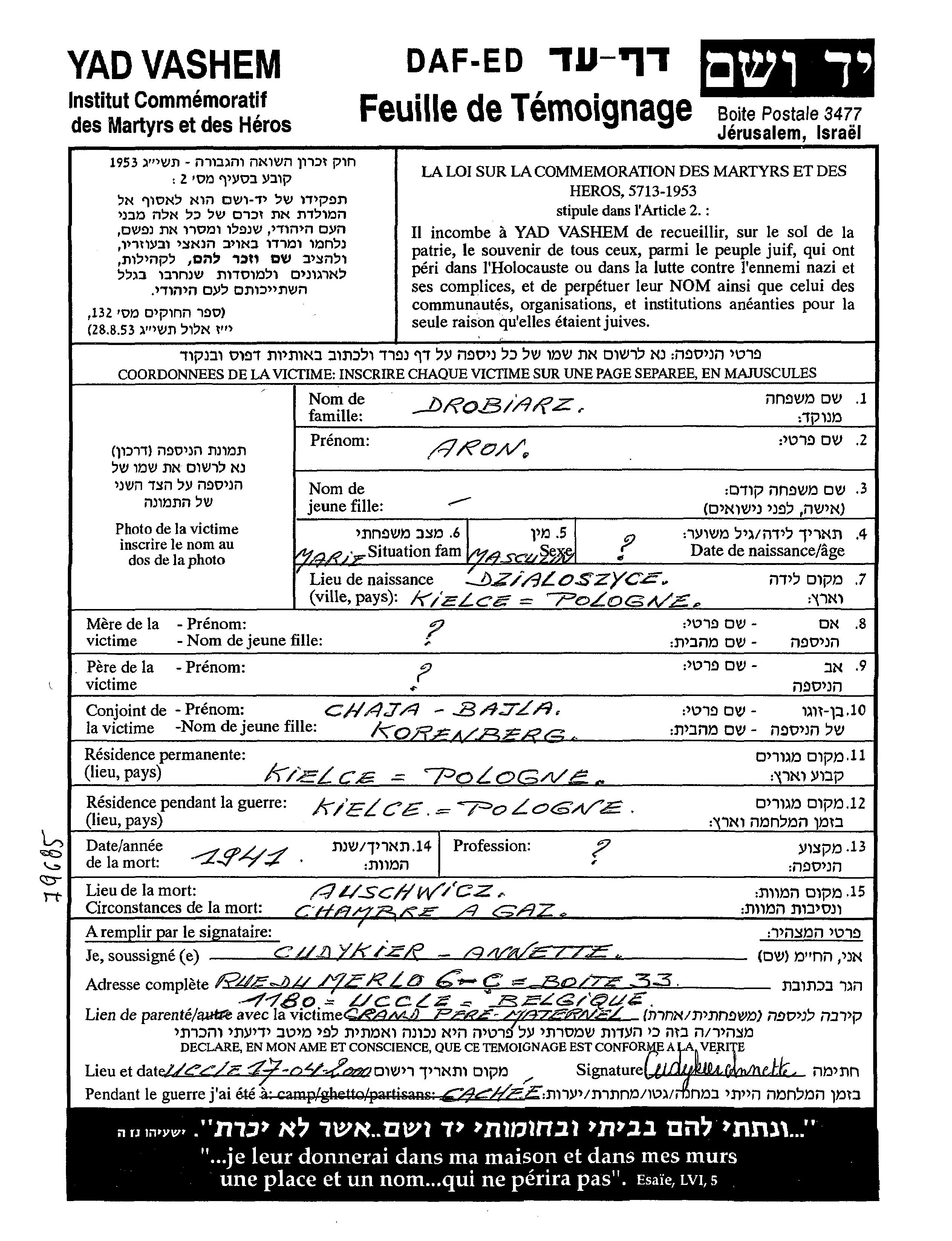 Drobiarz Aron Kielce, Pologne Feuille de témoignage