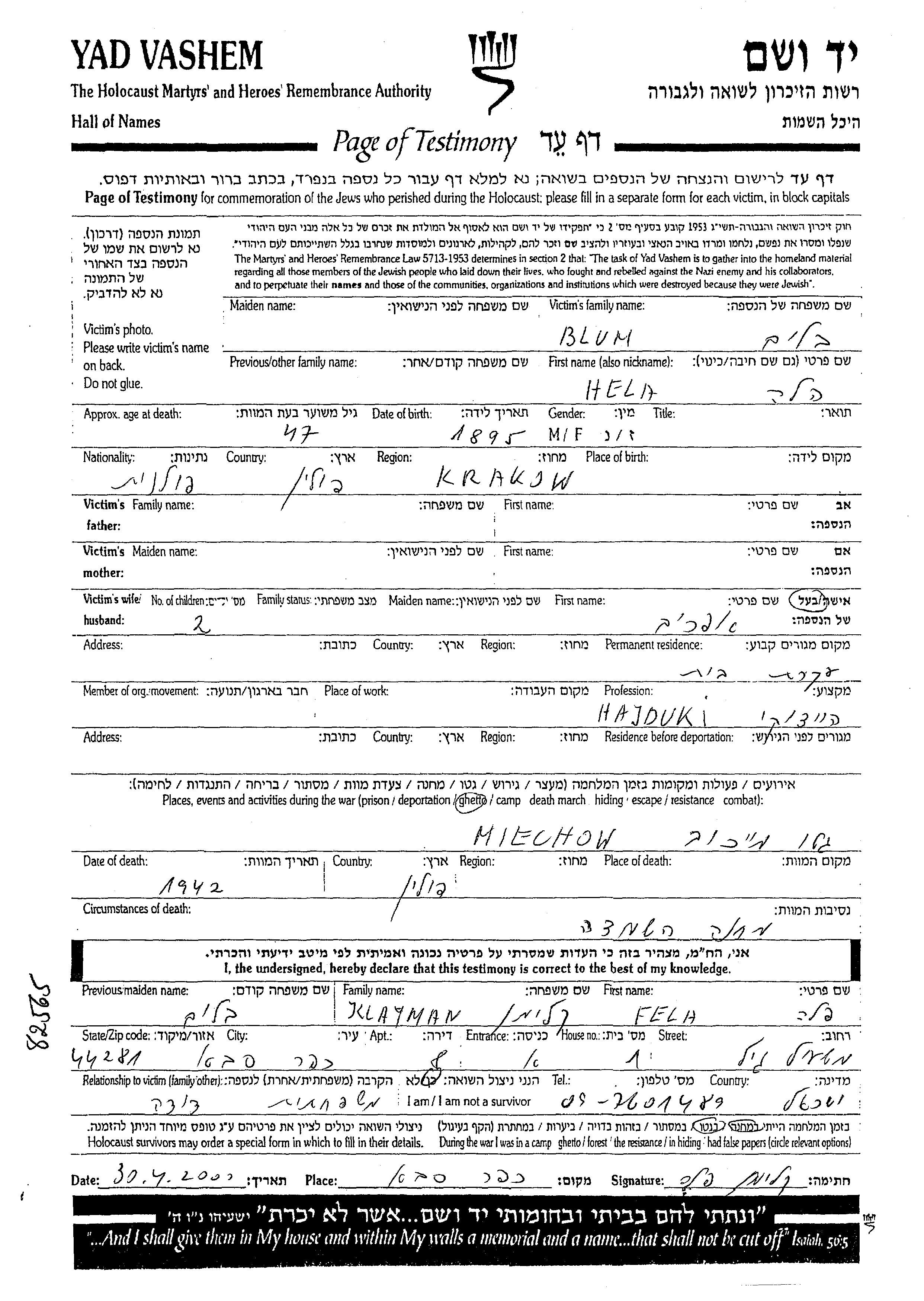 Hela Blum est née à Krakow, Pologne en 1895. Elle était Femme au foyer. Avant la seconde guerre mondiale elle vivait à Hajduki Wielkie, Pologne. Pendant la guerre, elle était à Miechow, Pologne.
