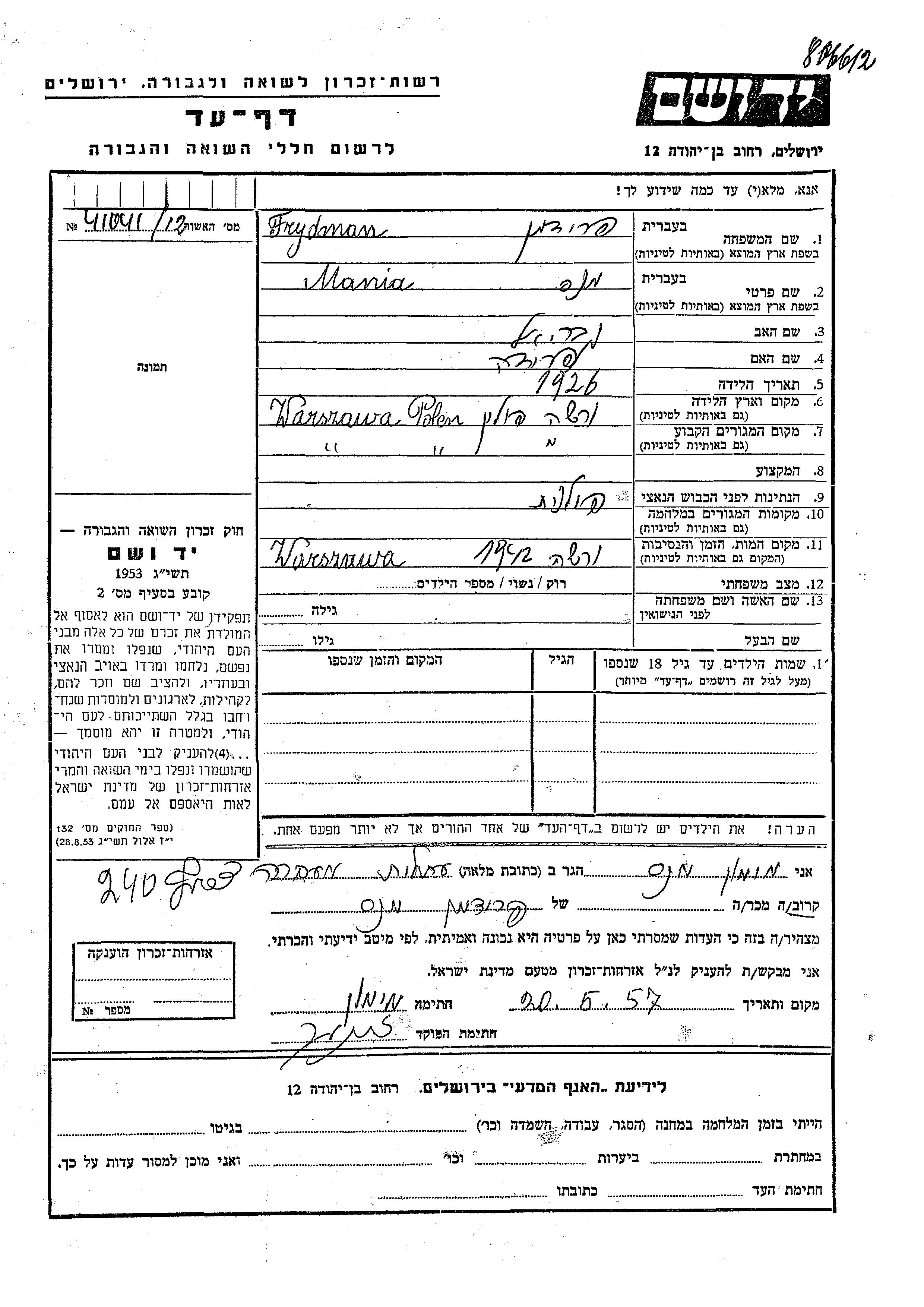 Frydman Mania Manes 1926 Varsha, Pologne Feuille de témoignage
