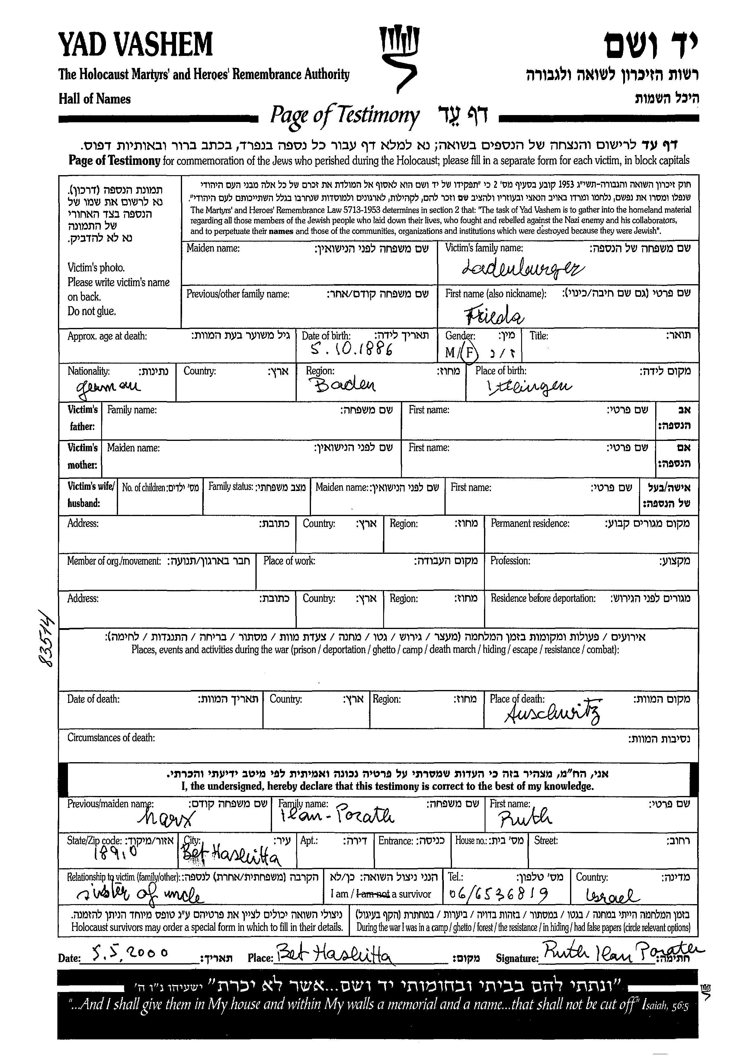 Yad Vashem - Pages of Testimony Names Memorial Collection