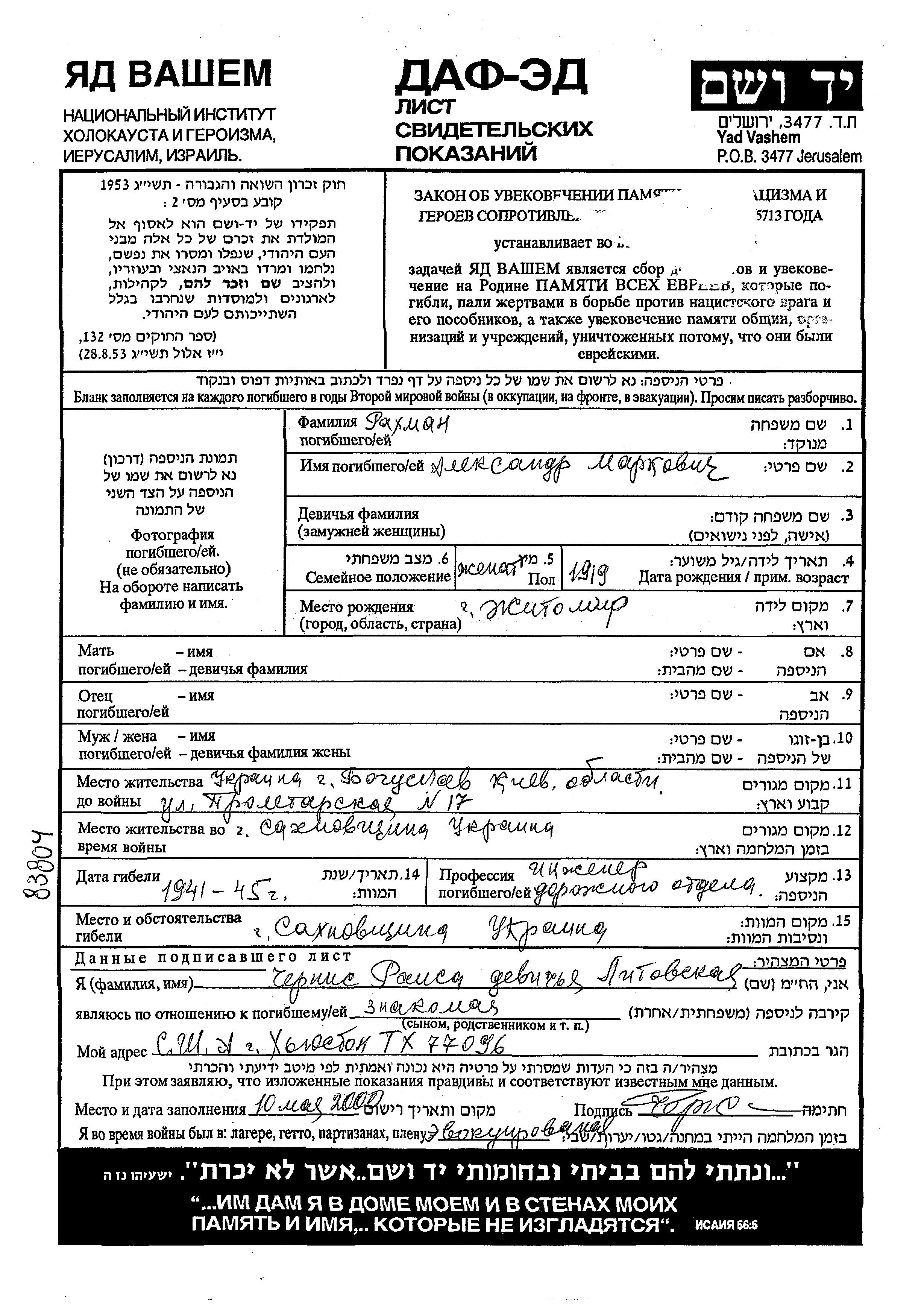 Rakhman Aleksandr 1919 Boguslav, Ukraine (URSS) Feuille de témoignage