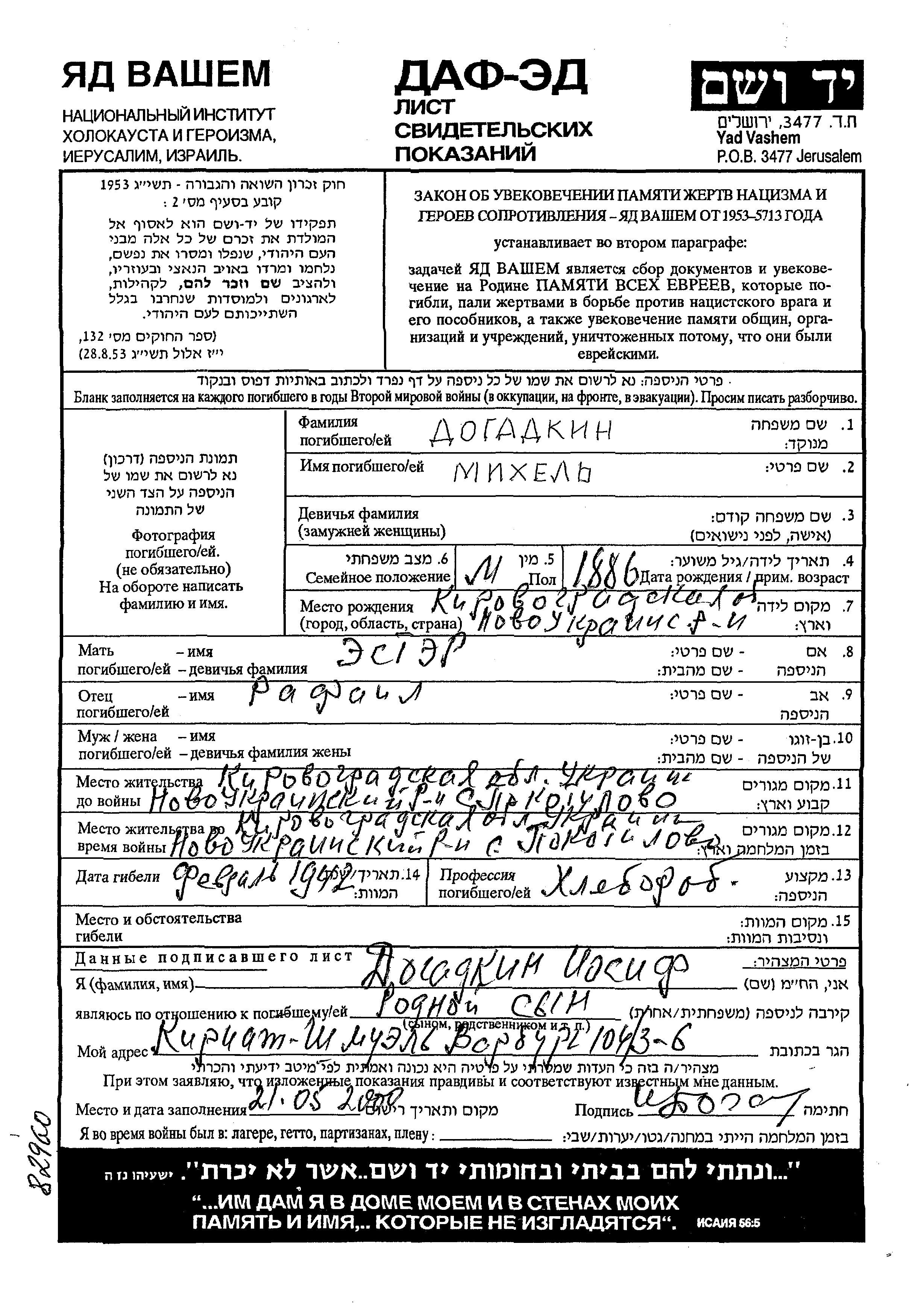 Dogadkin Mikhel 1886 Pokotilovo, Ukraine (URSS) Feuille de témoignage