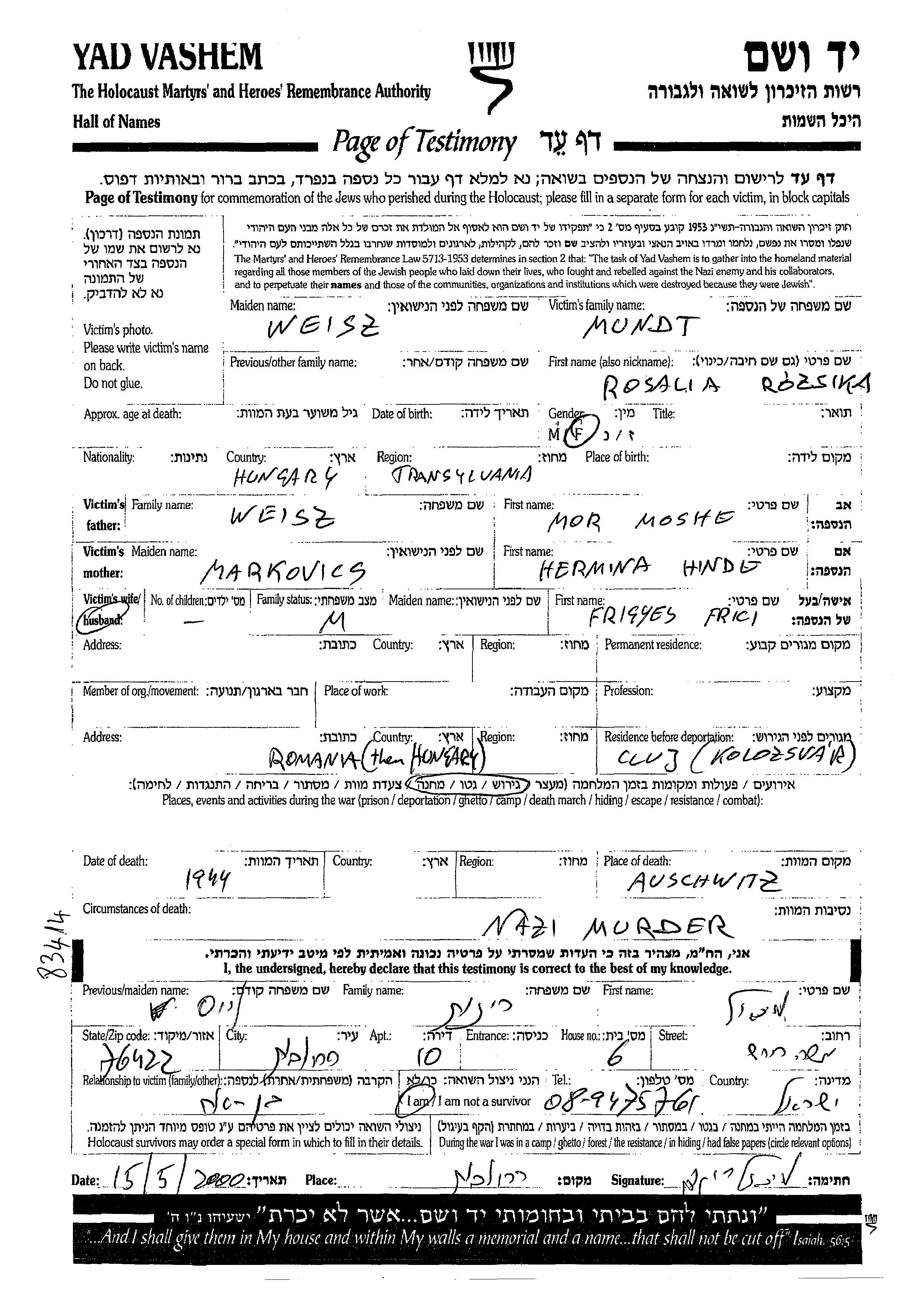 Mundt Rosalia endroit inconnu, Feuille de témoignage