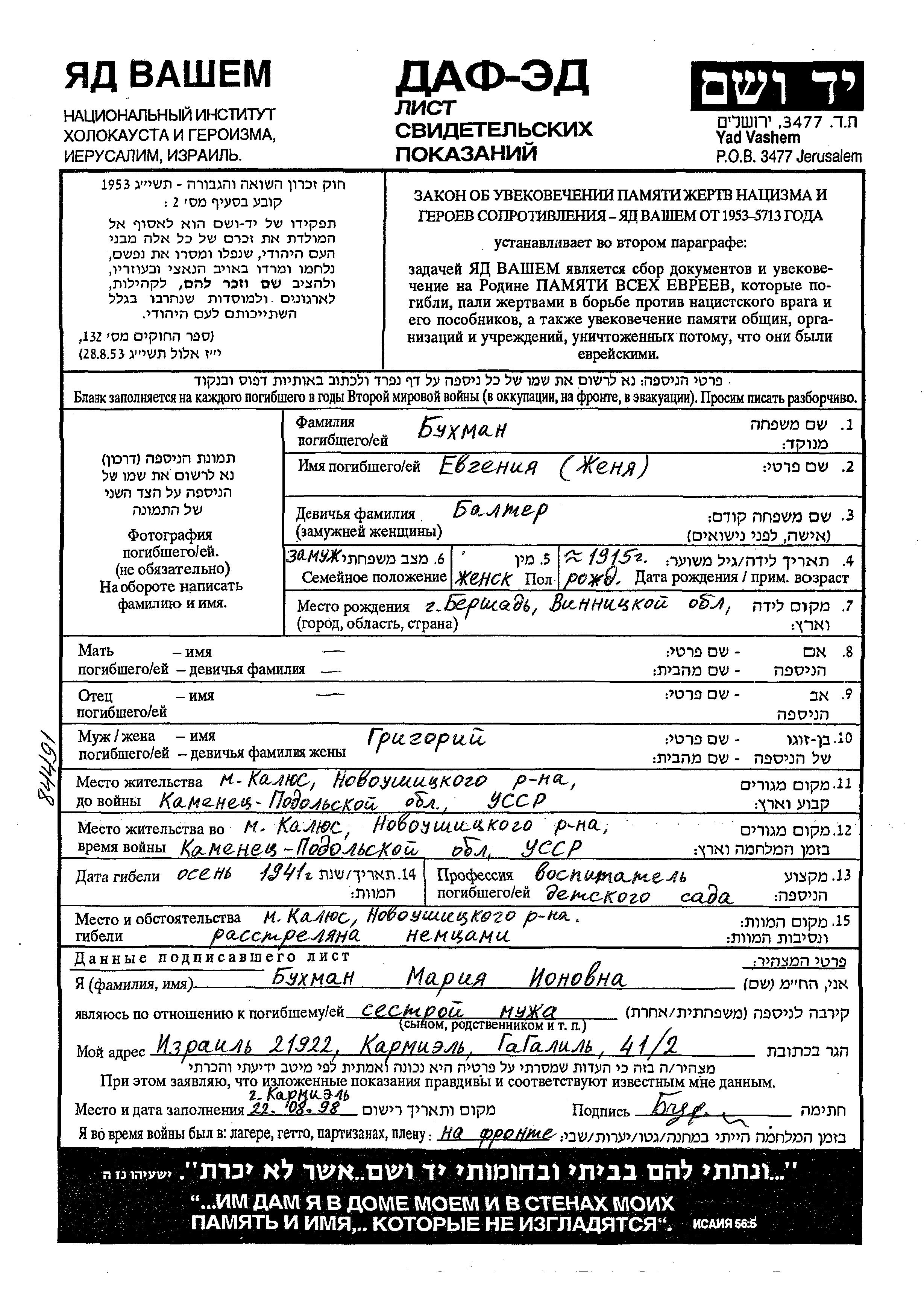 Bukhman Yevgenia Zhenya 1915 Kalyus, Ukraine (URSS) Feuille de témoignage