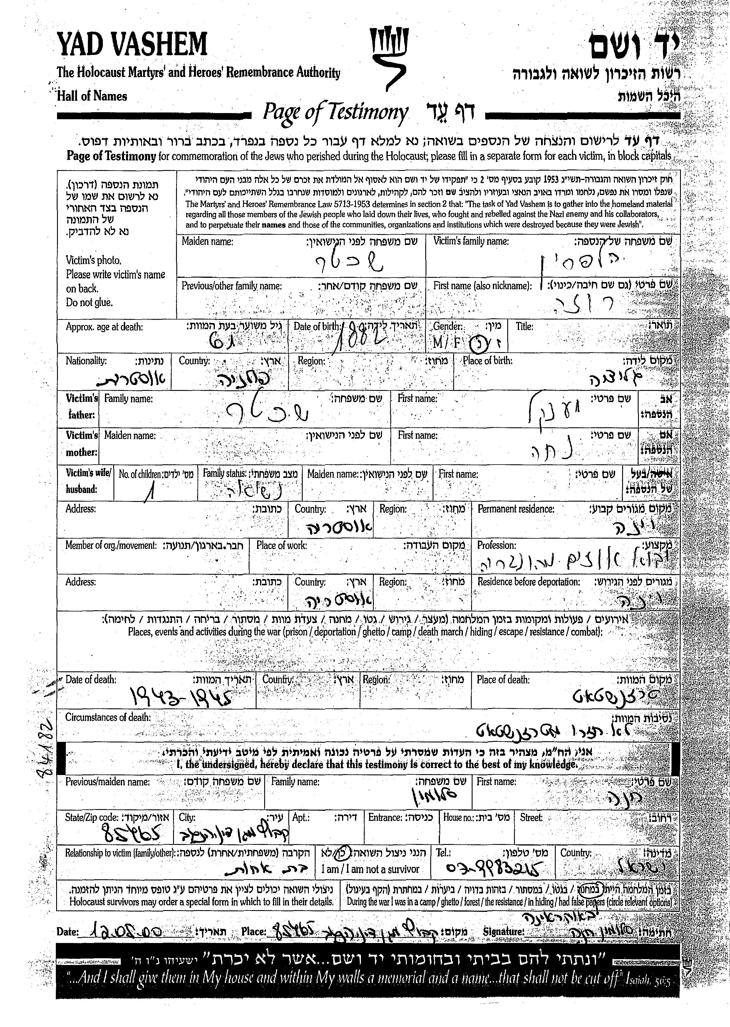 Yad Vashem - Pages of Testimony Names Memorial Collection