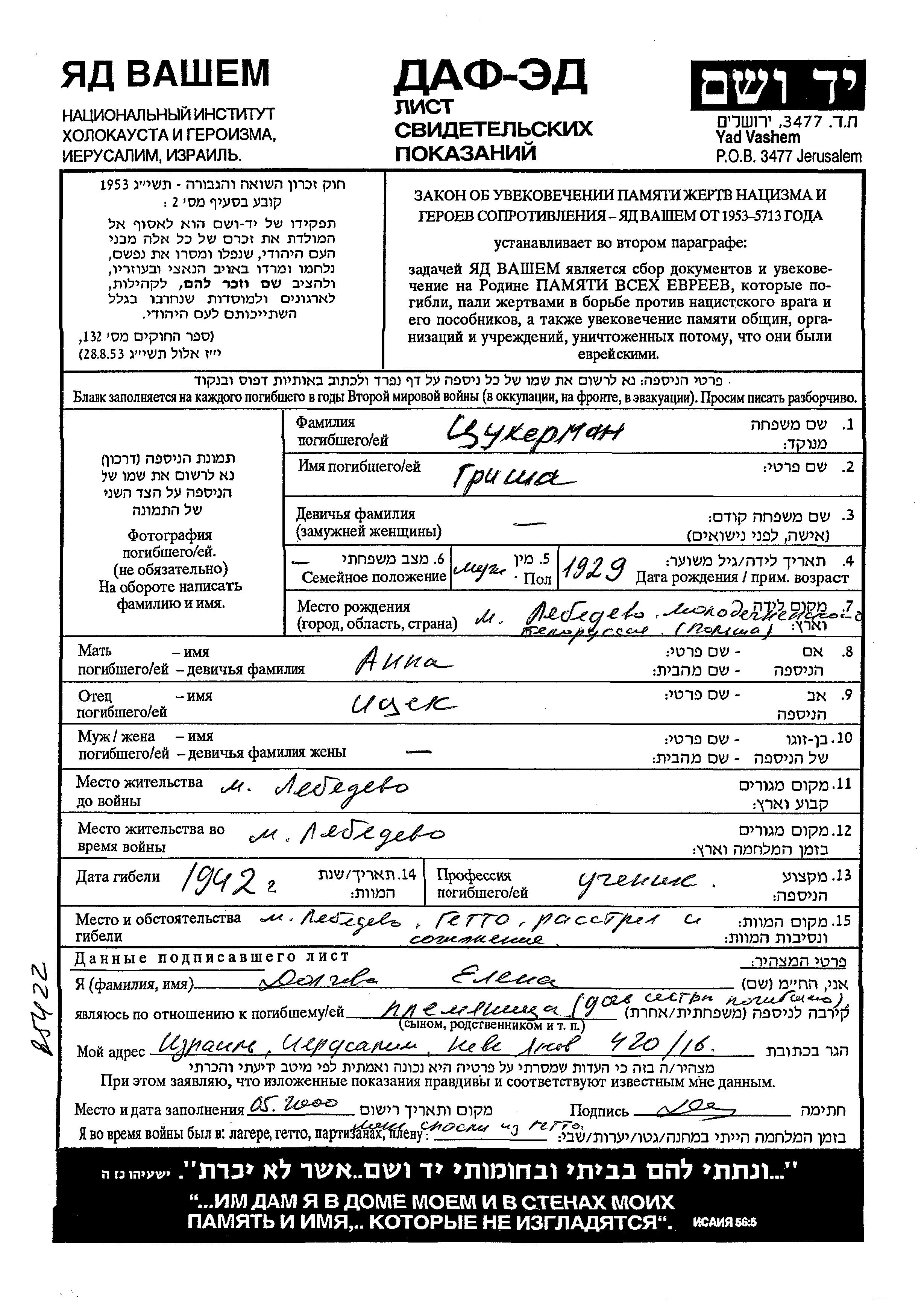 Tzukerman Grisha 1929 Lebedevo, Pologne Feuille de témoignage