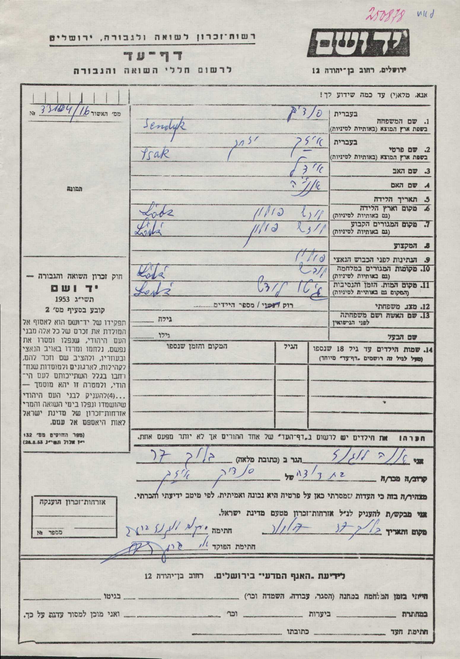 Sendyk Isak Lodz, Pologne Feuille de témoignage