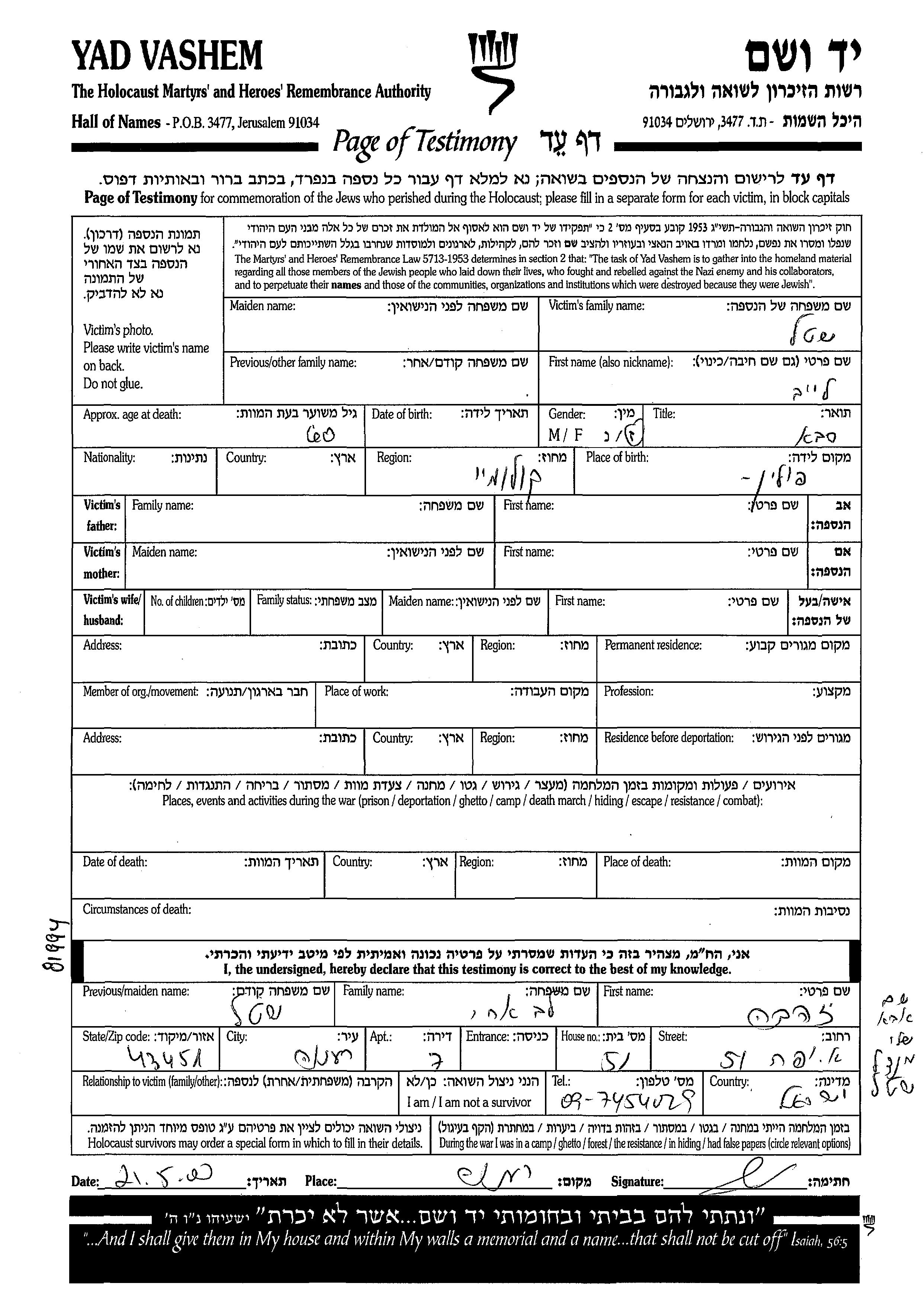 Yad Vashem - Pages of Testimony Names Memorial Collection