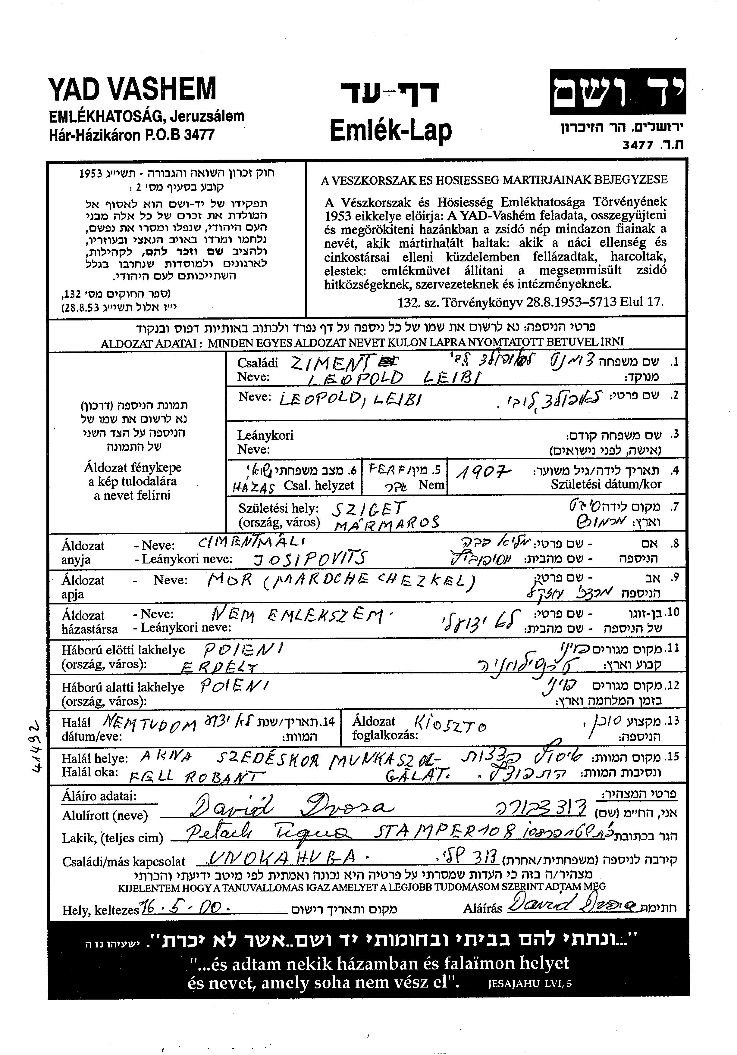 Leibi Leopold Libi Ziment est né à Sziget, Roumanie en 1907, fils de Mor Mardche et de Mali Malka Beba Mali. Il était Commerçant/e. Avant la seconde guerre mondiale il vivait à Poieni, Roumanie. Au cours de la guerre, il était à bataillons de travail forcé MUSZ dans les forces armées hongroises.