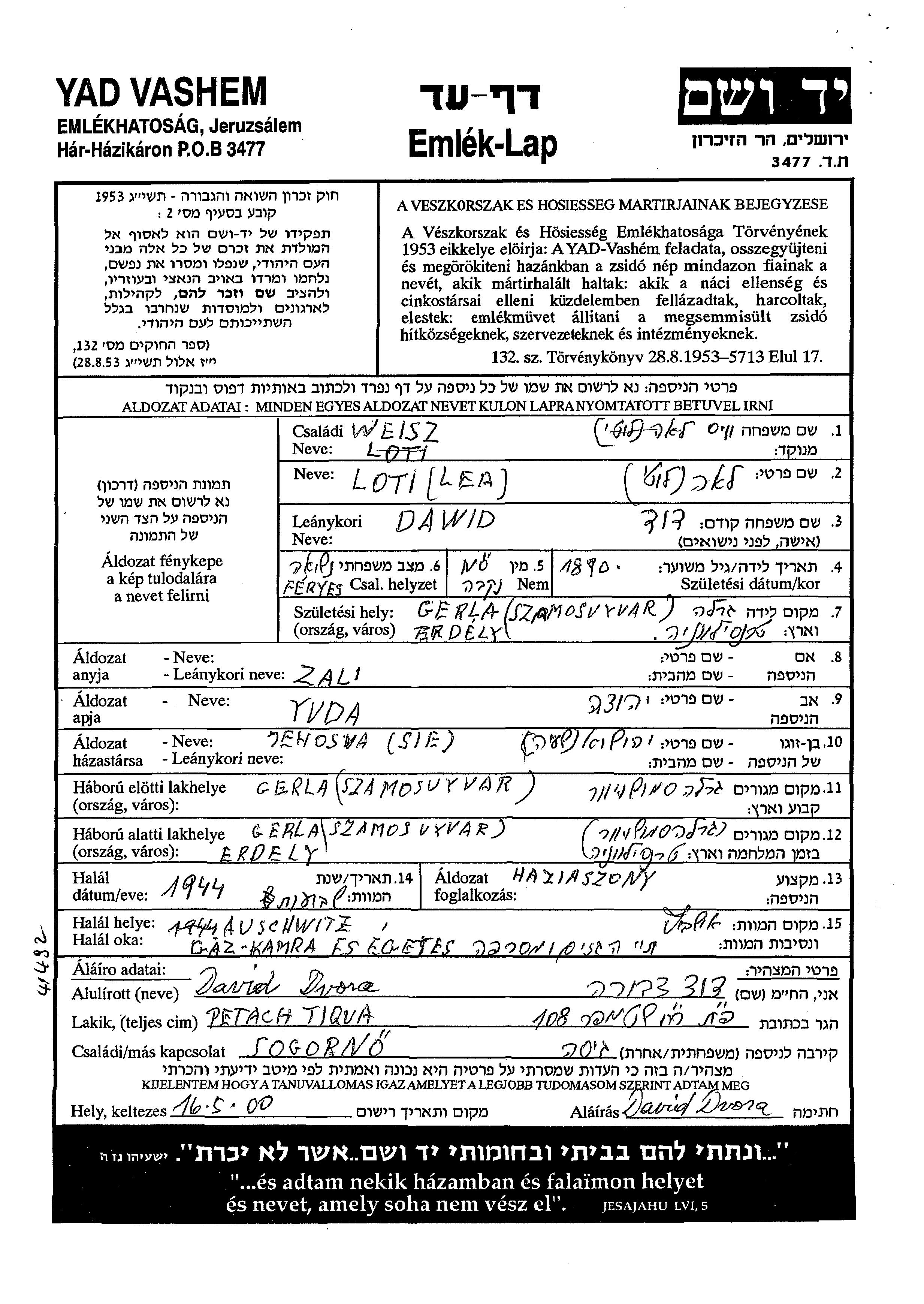 Loti Lea Weisz née Dawid est née à Gerla, Roumanie en 1890, fille de Yuda et de Zali. Elle était Femme au foyer et Mariée à Yehosua Shaia. Avant la seconde guerre mondiale elle vivait à Gerla, Roumanie. Pendant la guerre, elle était à Gerla, Roumanie.
