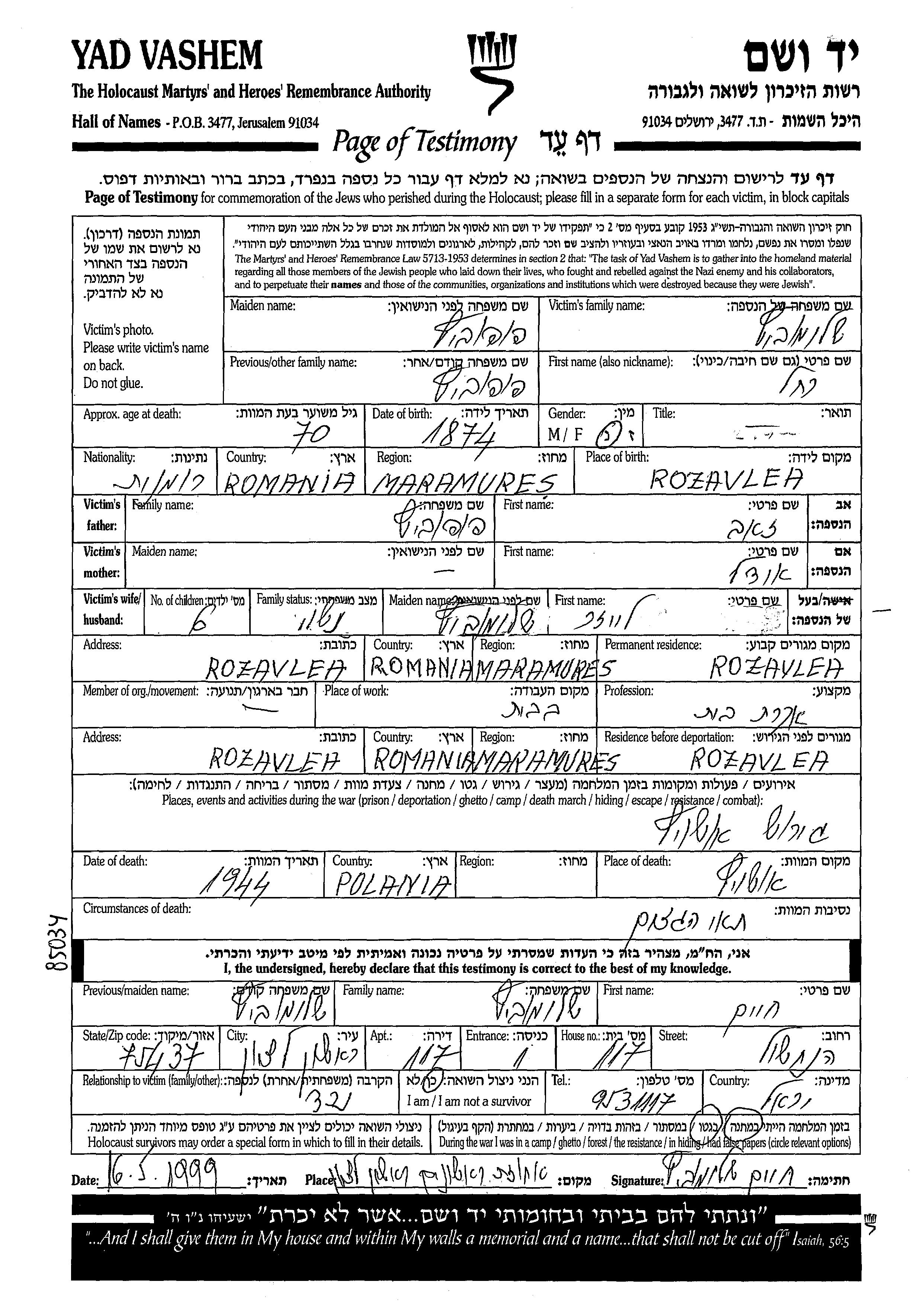 Yad Vashem - Pages of Testimony Names Memorial Collection