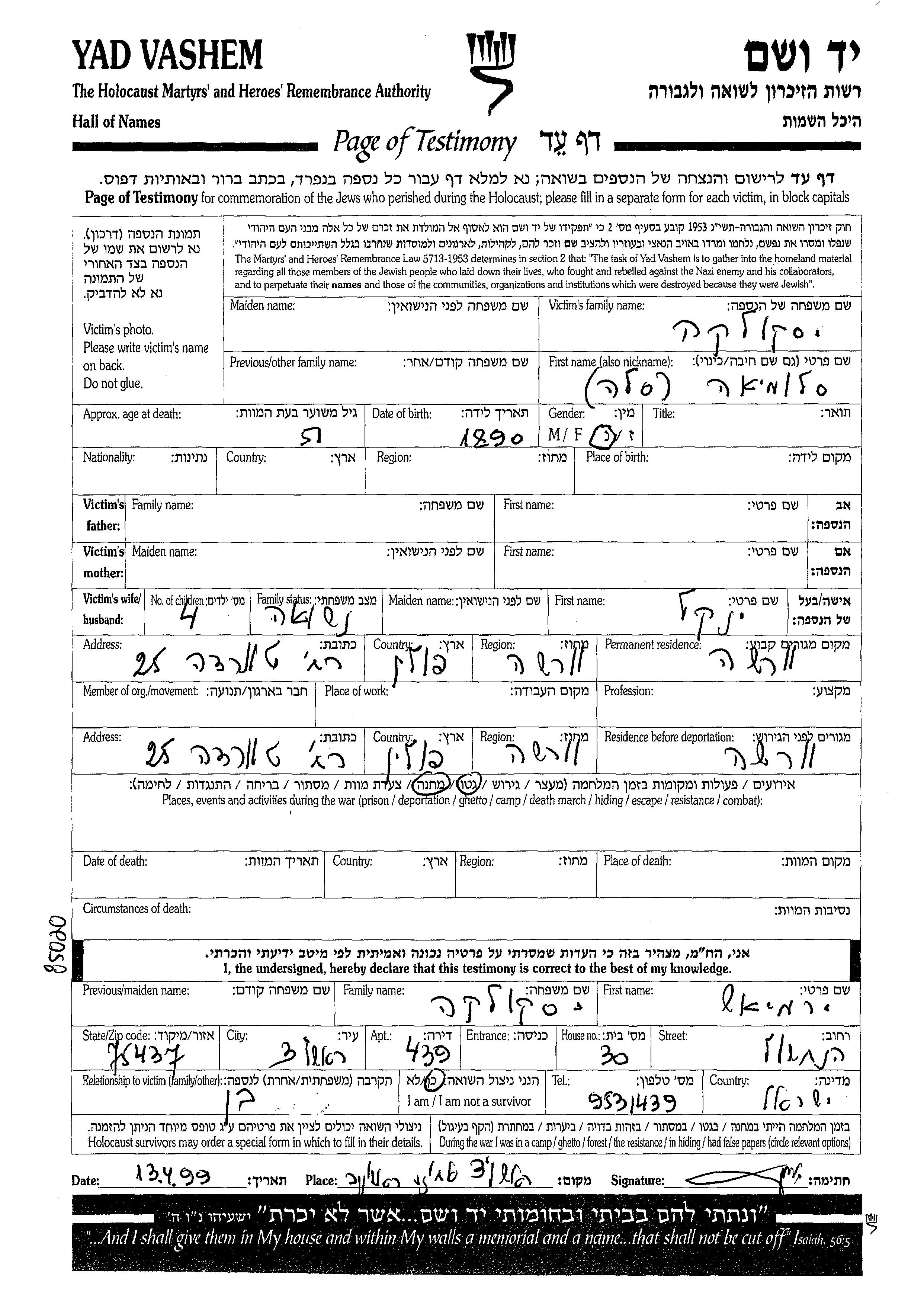 Yad Vashem - Pages of Testimony Names Memorial Collection