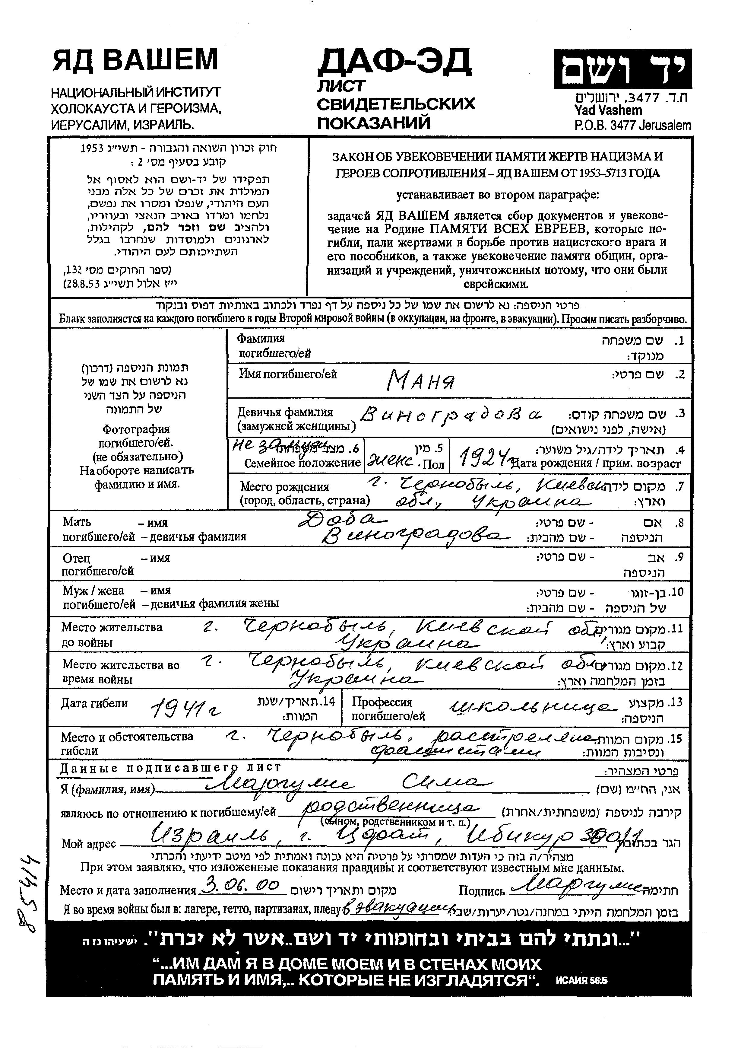 nom inconnu Manya 1924 Chernobyl, Ukraine (URSS) Feuille de témoignage