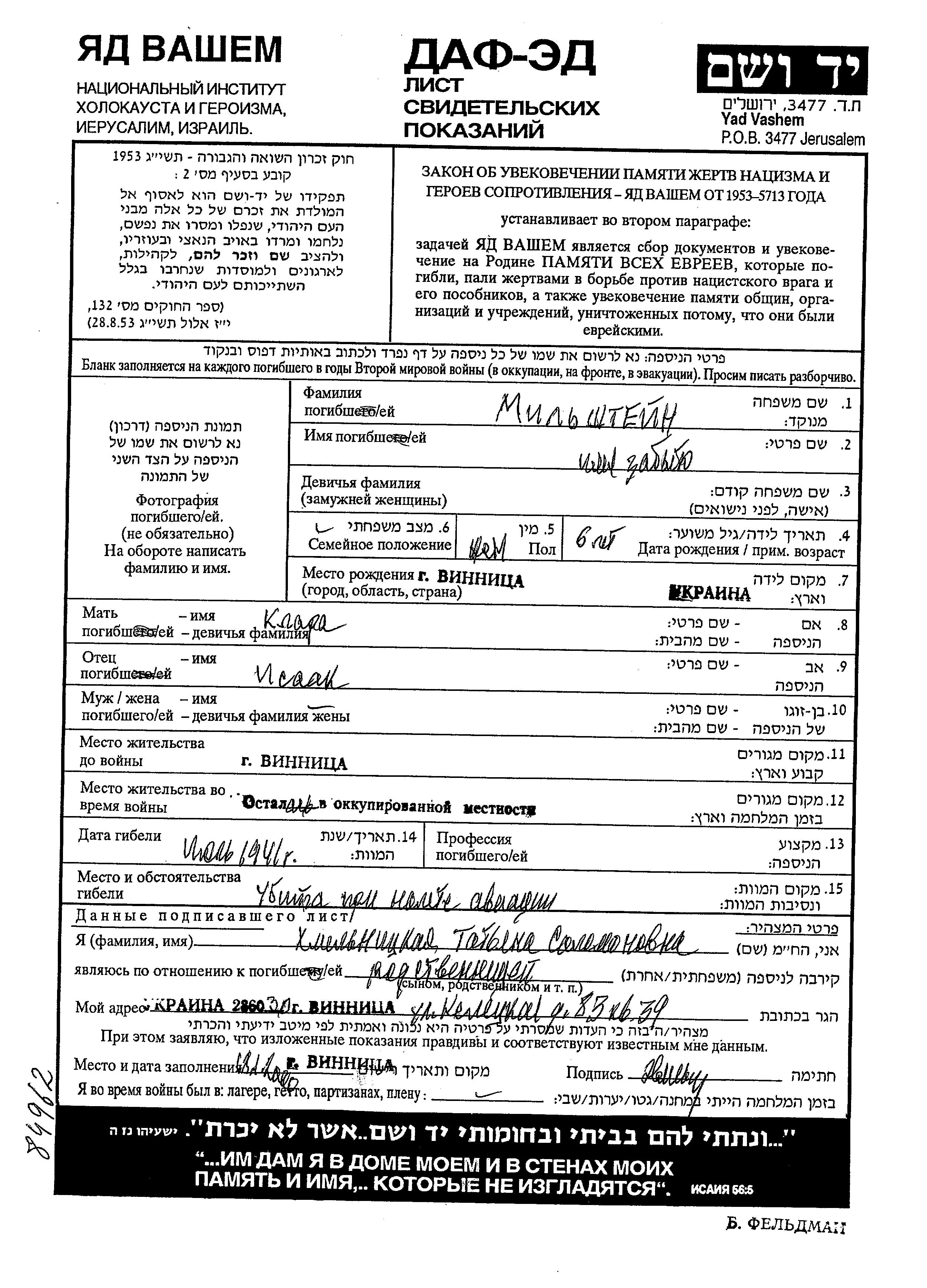 Milshtein prénom inconnu Vinnitsa, Ukraine (URSS) Feuille de témoignage