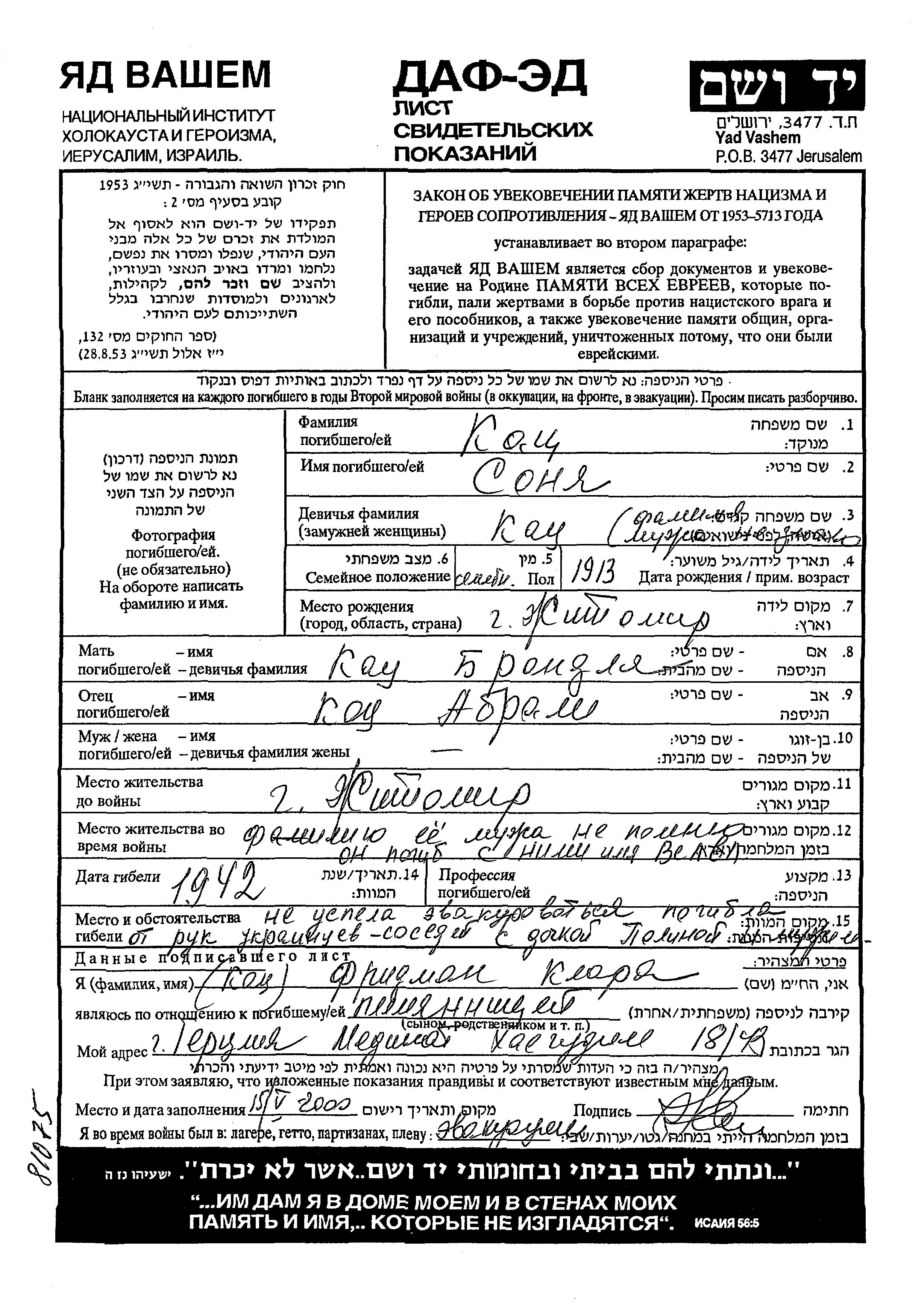 Katz Sonya 1913 Zhitomir, Ukraine (URSS) Feuille de témoignage