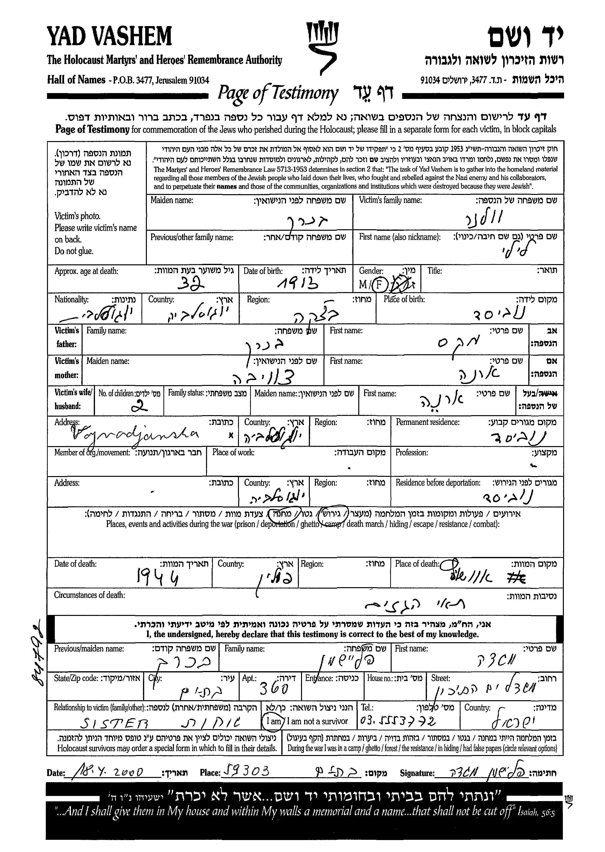 Yad Vashem - Pages of Testimony Names Memorial Collection