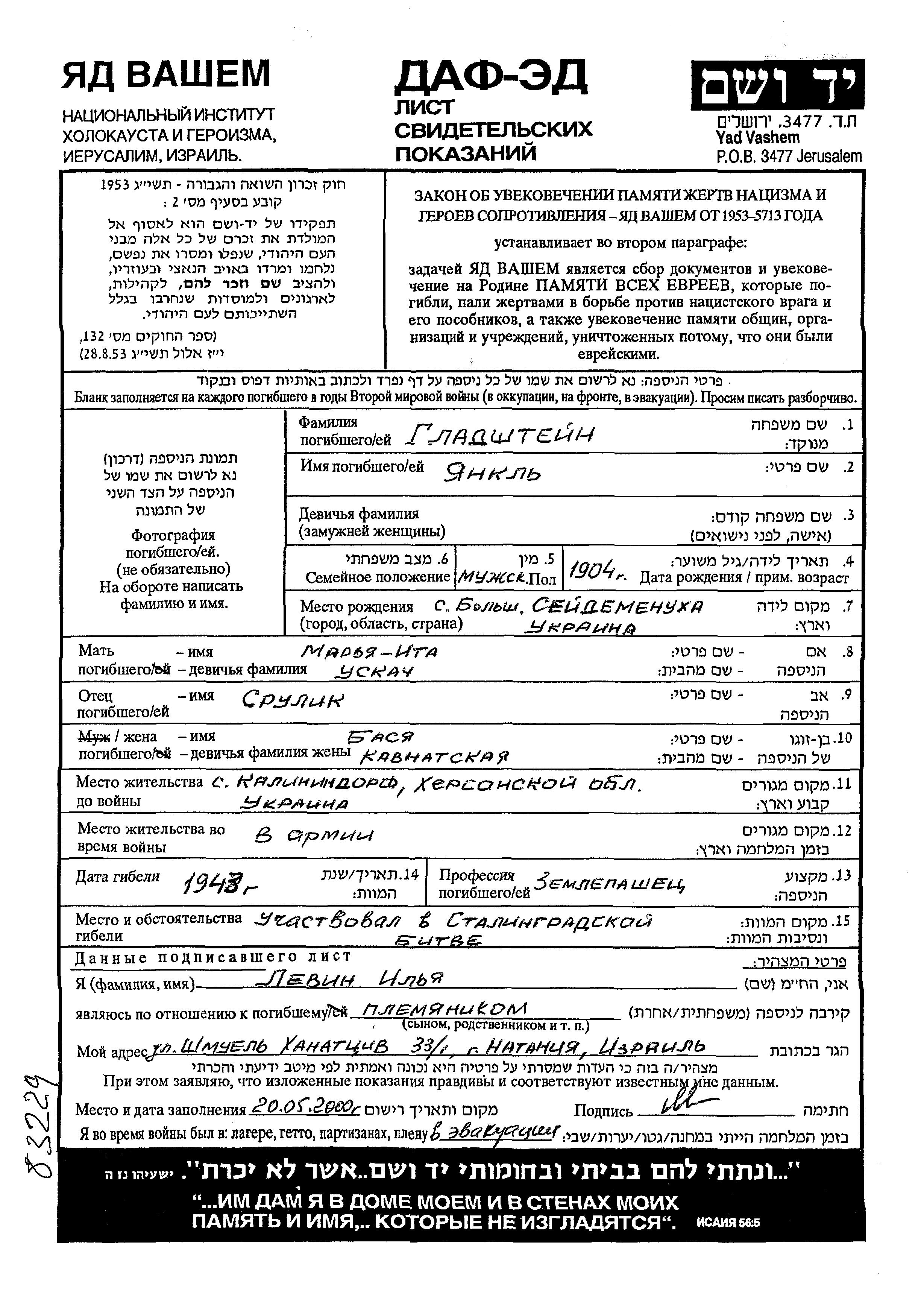 Yankl Gladshtein est né à Bolshaya Seydemenukha, Ukraine (URSS) en 1904, fils de Srulik et de Maria Ita. Il était Paysan/ne. Avant la seconde guerre mondiale il vivait à Kalinindorf, Ukraine (URSS). Au cours de la guerre, il était à the Soviet armed forces. Yankl a été tué en tant que militaire pendant la Seconde Guerre mondiale. Lieu de la mort: Stalingrad, Russie (URSS) en 1943.
