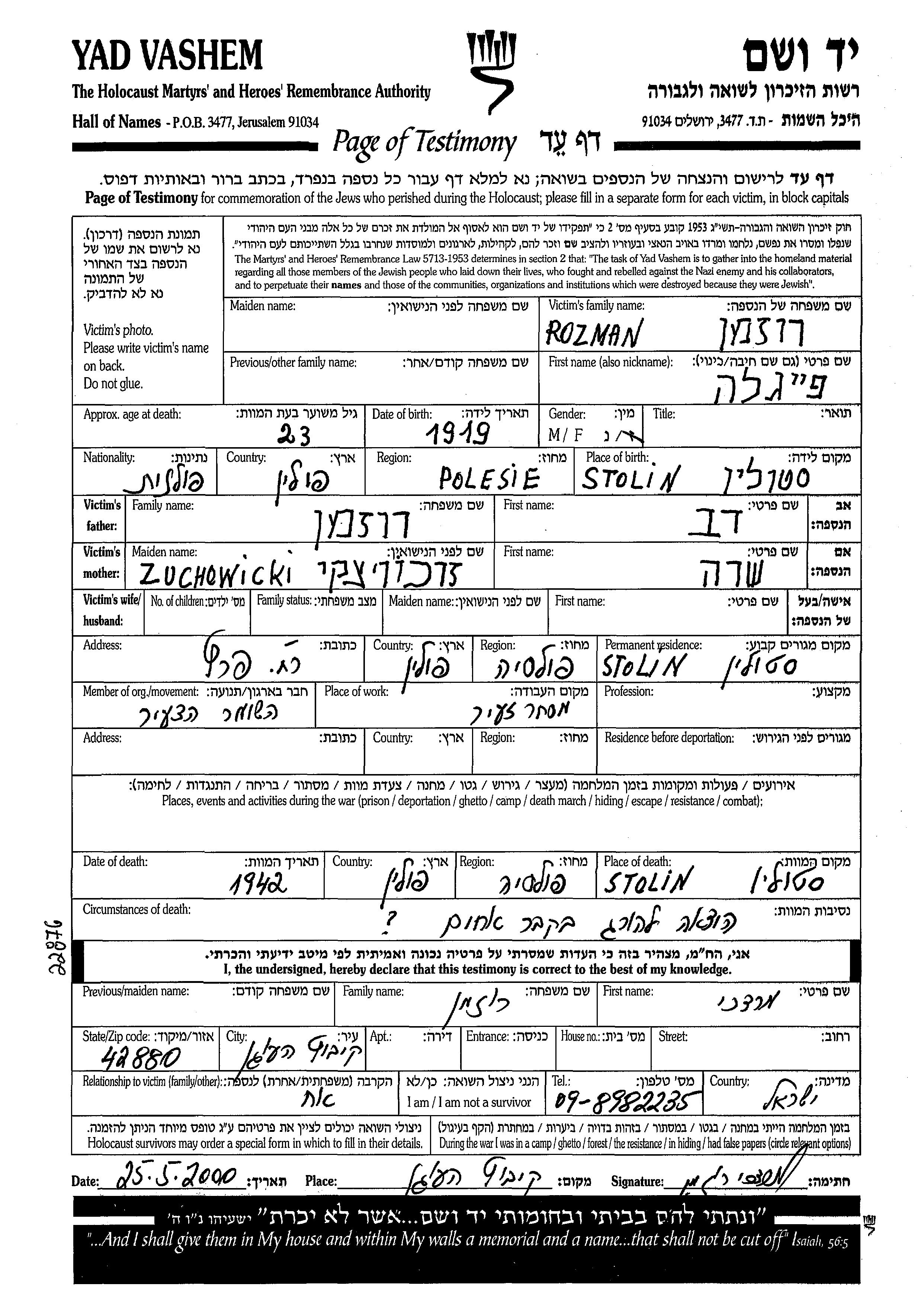 Rozman Feigele 1919 Stolin, Pologne Feuille de témoignage